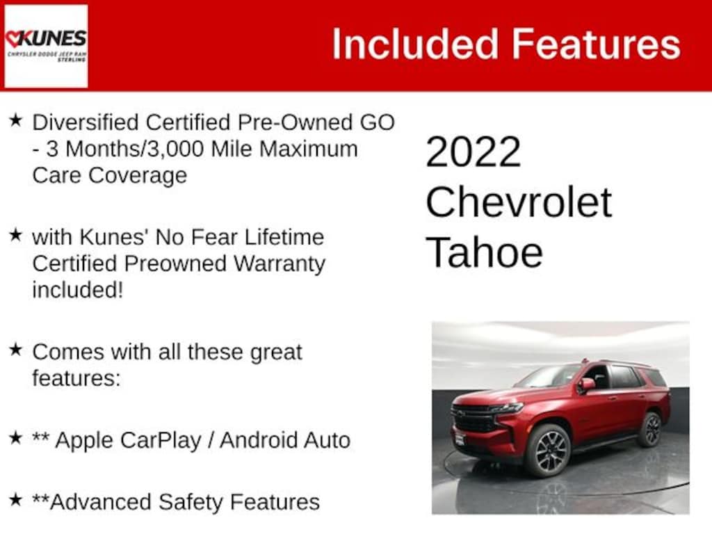 Cherry Red Tintcoat 2022 Chevrolet Tahoe RST RST Diversified Certified Pre-Owned GO - 3 Months/3,000 Mile Maximum Care Coverage, with Kunes' No Fear Lifetime Certified Preowned Warranty included!, Comes with all these great features:, ** Apple CarPlay / Android Auto, **Advanced Safety Features, ** Navigation, ** Security System, *** Moonroof/sunroof, **Panoramic Sunroof, ** Heated Seats, **Heated Steering wheel, **Heated Rear Seating, 2nd Row Captain Chairs, 3rd Row Seating, ** Steering Wheel Controls, ** Roof Rack, ** Premium Wheels, ** Keyless Entry, ** Automatic Headlights, ** Bluetooth, ** Back up Camera, **Rear Park Assist, **SIRIUS XM, Remote Start, 10-Way Power Driver & Passenger Seat Adjusters, 1st & 2nd Row Color-Keyed Carpeted Floor Mats, 2nd Row Pwr Release 60/40 Split-Folding Bench Seat, 3.23 Rear Axle Ratio, 3rd Row 60/40 Power-Folding Split-Bench Seat, 3rd row seats: split-bench, 9 Speakers, Alloy wheels, AM/FM radio: SiriusXM with 360L, Apple CarPlay/Android Auto, Auto-Dimming Inside Rear-View Mirror, Automatic Stop/Start, Bose 9-Speaker Stereo Audio System Feature, Bright Front & Rear Door Sill Plates, Bumpers: body-color, Color-Keyed Carpeting Floor Covering, Compass, Delay-off headlights, Driver & Front Outboard Passenger Airbags, Driver Alert Package, Driver door bin, Enhanced Driver Information Center, Floor Console w/Storage Area, Four wheel independent suspension, Front anti-roll bar, Front Bucket Seats, Front Center Armrest, Front High-Back Reclining Bucket Seats, Hands-Free Rear Power Programmable Liftgate, HD Surround Vision, Heated 2nd Row Outboard Seats, Heated Steering Wheel, Illuminated entry, Infotainment Display, Lane Change Alert w/Side Blind Zone Alert, Leather-Wrapped Steering Wheel, LED Daytime Running Lamps, License Plate Front Mounting Package, Low tire pressure warning, Luxury Package, Memory Settings, Memory Settings for Driver, Navigation System, Not Equipped w/Steering Column Lock, Occupant sensing airbag, Outside Heated Power-Adjustable Mirrors, Outside temperature display, Overhead airbag, Overhead console, Passenger door bin, Power Liftgate, Power passenger seat, Power Release 2nd Row Bucket Seats, Power Tilt & Telescopic Steering Column, Power windows, Preferred Equipment Group 1SP, Premium audio system: Chevrolet Infotainment System 3, Radio: Chevrolet Infotainment 3 Premium System, Rear anti-roll bar, Rear Cross Traffic Alert, Rear Pedestrian Alert, Rear reading lights, Rear seat center armrest, Rear window wiper, Remote Start, Set of 4 Wheel Locks (LPO), SiriusXM Radio w/360L, Speed control, Speed-sensing steering, Split folding rear seat, Spoiler, Start/Stop System Disable Button, Tachometer, Telescoping steering wheel, Tilt steering wheel, Trip computer, Universal Home Remote, Voltmeter, Wheels: 22" x 9" Bright Machined, Wireless Charging.