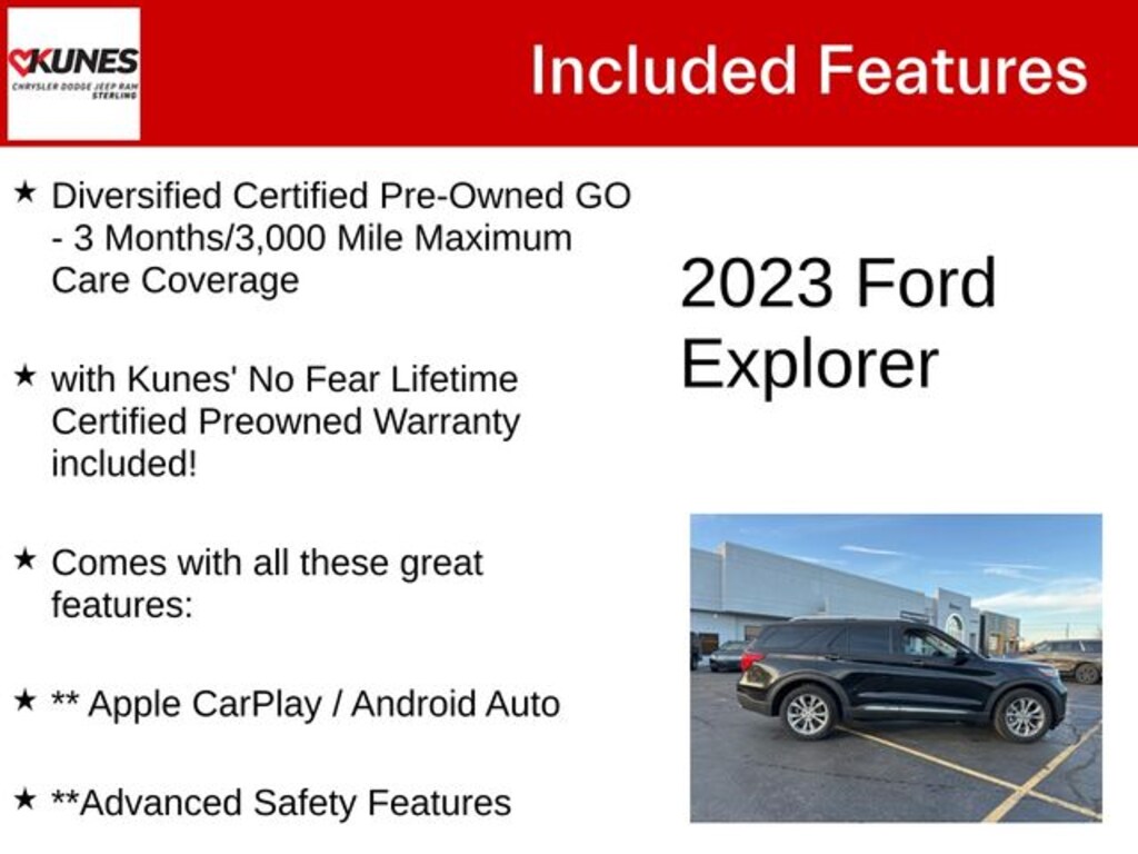 Black Metallic 2023 Ford Explorer Limited Limited Diversified Certified Pre-Owned GO - 3 Months/3,000 Mile Maximum Care Coverage, with Kunes' No Fear Lifetime Certified Preowned Warranty included!, Comes with all these great features:, ** Apple CarPlay / Android Auto, **Advanced Safety Features, ** Navigation, ** Security System, **Heated and Cooled Seats, **Heated Steering wheel, 3rd Row Seating, ** Steering Wheel Controls, ** Keyless Entry, ** Automatic Headlights, ** Bluetooth, ** Back up Camera, **Rear Park Assist, **SIRIUS XM, Remote Start, 12 Speakers, 4-Wheel Disc Brakes, Alloy wheels, AM/FM radio: SiriusXM, Auto High-beam Headlights, Automatic temperature control, Delay-off headlights, Driver door bin, FordPass Connect, Four wheel independent suspension, Front anti-roll bar, Front Center Armrest, Front dual zone A/C, Front fog lights, Front reading lights, Fully automatic headlights, Garage door transmitter, Heated door mirrors, Heated front seats, Heated rear seats, Heated steering wheel, Illuminated entry, Knee airbag, Leather Heated/Ventilated Captain's Chairs, Leather steering wheel, Occupant sensing airbag, Outside temperature display, Overhead airbag, Overhead console, Passenger door bin, Passenger vanity mirror, Power Liftgate, Power passenger seat, Power steering, Power windows, Radio data system, Radio: B&O Sound System by Bang & Olufsen, Rear anti-roll bar, Rear reading lights, Rear window defroster, Rear window wiper, Remote keyless entry, Speed-sensing steering, Speed-Sensitive Wipers, Split folding rear seat, Spoiler, Steering wheel mounted audio controls, SYNC 3 Communications & Entertainment System, SYNC 3/Apple CarPlay/Android Auto, Tachometer, Telescoping steering wheel, Tilt steering wheel, Trip computer, Variably intermittent wipers, Ventilated front seats. Recent Arrival!