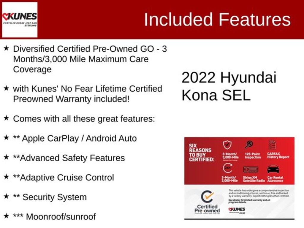 Ultra Black 2022 Hyundai Kona SEL SEL Diversified Certified Pre-Owned GO - 3 Months/3,000 Mile Maximum Care Coverage, with Kunes' No Fear Lifetime Certified Preowned Warranty included!, Comes with all these great features:, ** Apple CarPlay / Android Auto, **Advanced Safety Features, **Adaptive Cruise Control, ** Security System, *** Moonroof/sunroof, ** Heated Seats, ** Steering Wheel Controls, ** Roof Rack, ** Premium Wheels, ** Keyless Entry, ** Automatic Headlights, ** Bluetooth, ** Back up Camera, **SIRIUS XM, Remote Start, Emergency communication system: Blue Link Connected Car Service (3-year complimentary subscription), Power Windows w/Front Auto-Down/Up, Roof Rack Cross Rails.