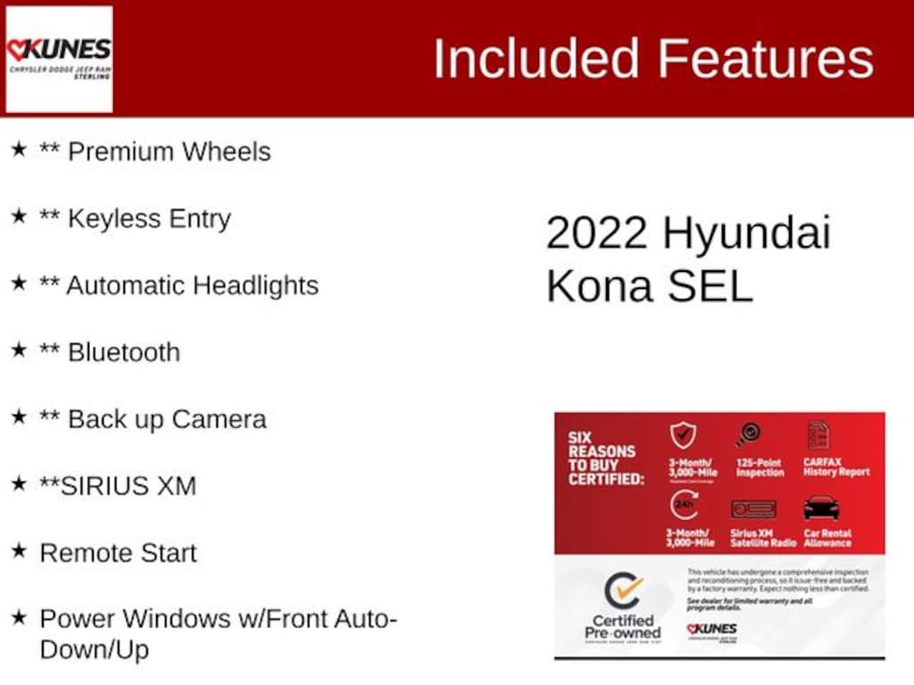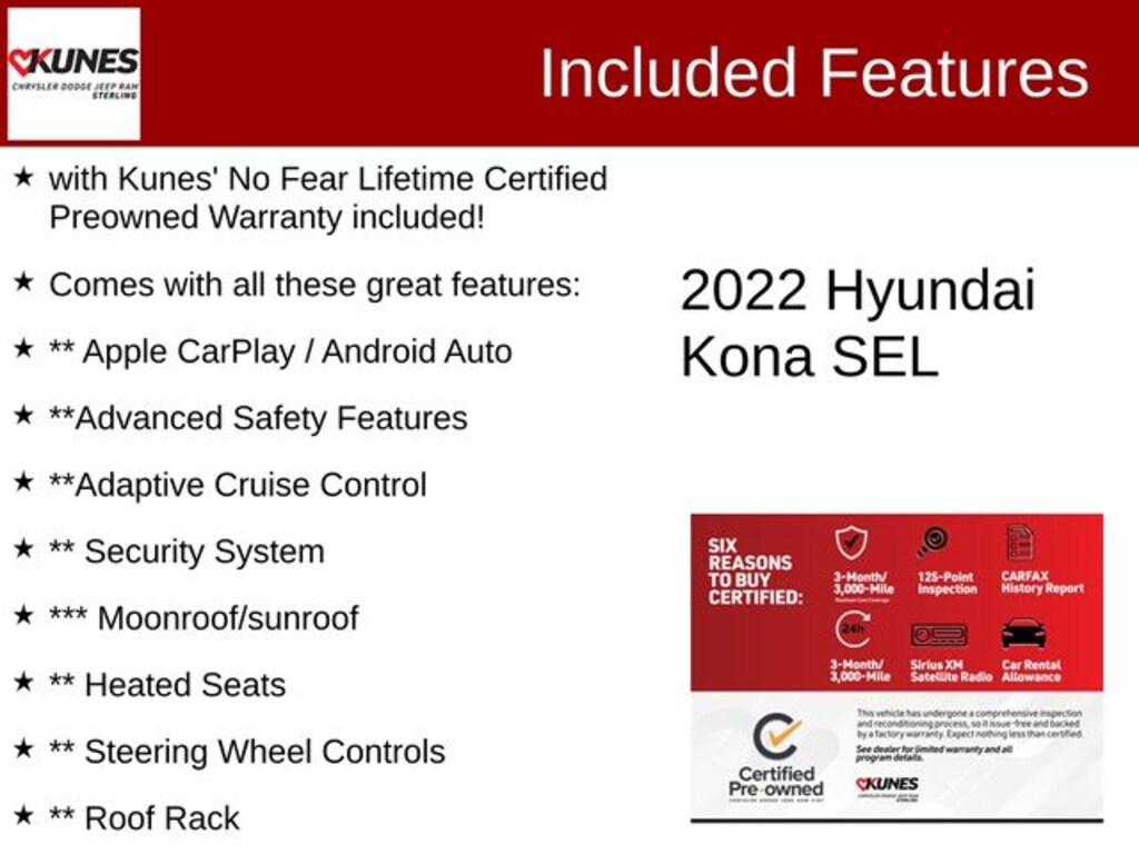 Ultra Black 2022 Hyundai Kona SEL SEL with Kunes' No Fear Lifetime Certified Preowned Warranty included!, Comes with all these great features:, ** Apple CarPlay / Android Auto, **Advanced Safety Features, **Adaptive Cruise Control, ** Security System, *** Moonroof/sunroof, ** Heated Seats, ** Steering Wheel Controls, ** Roof Rack, ** Premium Wheels, ** Keyless Entry, ** Automatic Headlights, ** Bluetooth, ** Back up Camera, **SIRIUS XM, Remote Start, Emergency communication system: Blue Link Connected Car Service (3-year complimentary subscription), Power Windows w/Front Auto-Down/Up, Roof Rack Cross Rails.