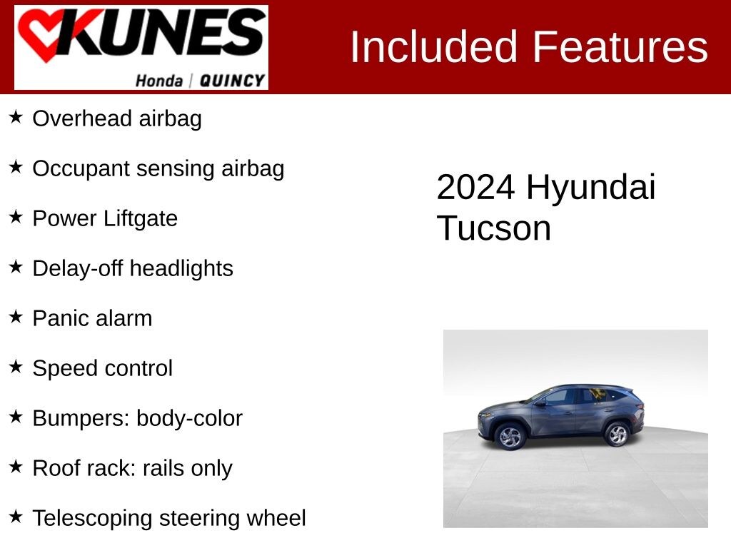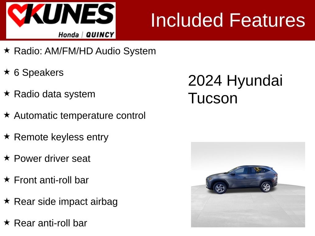 Certified. CARFAX One-Owner. Clean CARFAX. Hampton Gray 2024 Hyundai Tucson SEL AWD 8-Speed Automatic with SHIFTRONIC 2.5L I4 DGI DOHC 16V LEV3-SULEV30 187hp NAVIGATION, HEATED/COOLED SEATS, ADAPTIVE CRUISE, ADVANCED SAFETY Tech, HEATED SEATS, BACKUP CAMERA, SIRIUSXM RADIO, BLUETOOTH, SMARTPHONE APP ENABLED, APPLE CAR PLAY/ ANDROID AUTO, AWD, 6 Speakers, Automatic temperature control, Bumpers: body-color, Delay-off headlights, Front anti-roll bar, Front Center Armrest, Front reading lights, Heated front seats, Occupant sensing airbag, Overhead airbag, Overhead console, Panic alarm, Passenger door bin, Power driver seat, Power Liftgate, Radio data system, Radio: AM/FM/HD Audio System, Rear anti-roll bar, Rear side impact airbag, Rear window wiper, Remote keyless entry, Roof rack: rails only, Speed control, Stain & Odor Resistant Cloth Seat Trim, Tachometer, Telescoping steering wheel, Variably intermittent wipers, Wheels: 17" x 7.0J" Alloy, Wheels: 19" x 7.5J" Machine-Face Finish Alloy. 23/29 City/Highway MPG