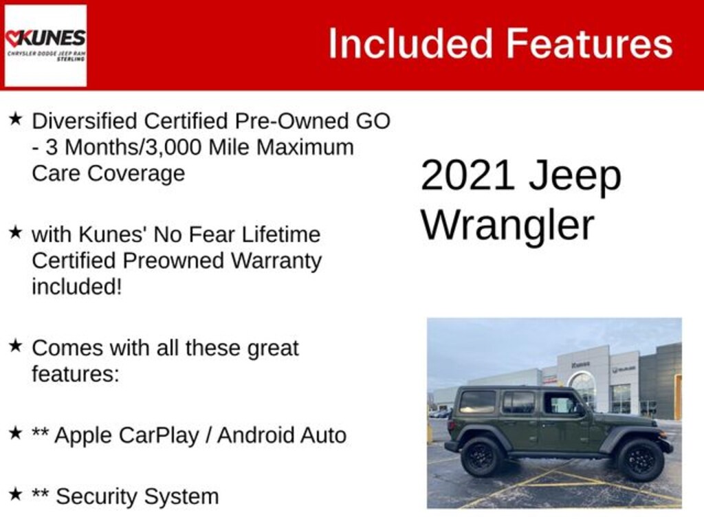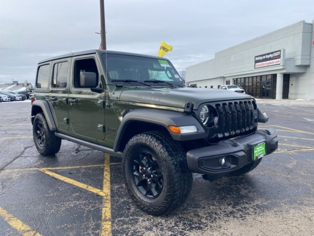Sarge Green Clearcoat 2021 Jeep Wrangler Unlimited Willys Unlimited Willys Diversified Certified Pre-Owned GO - 3 Months/3,000 Mile Maximum Care Coverage, with Kunes' No Fear Lifetime Certified Preowned Warranty included!, Comes with all these great features:, ** Apple CarPlay / Android Auto, ** Security System, ** Heated Seats, **Heated Steering wheel, ** Steering Wheel Controls, ** Keyless Entry, ** Automatic Headlights, ** Bluetooth, ** Back up Camera, **SIRIUS XM, Remote Start, 240 Amp Alternator, 700 Amp Maintenance Free Battery, Air Conditioning w/Auto Temperature Control, Air Filtering, Anti-Spin Differential Rear Axle, Aux Battery, Black Trail Rated Badge, Driver door bin, Freedom Panel Storage Bag, Front 1-Touch Down Power Windows, Front Center Armrest w/Storage, GPS Antenna Input, Integrated Center Stack Radio, Matte Black Jeep Badge, Mold In Color Bumper w/Gloss Black, MOPAR All-Weather Floor Mats (DISC), Normal Duty Suspension, Occupant sensing airbag, Passenger door bin, Radio data system, Radio: Uconnect 4 w/7" Display, Rear anti-roll bar, Rear reading lights, Rear Window Wiper/Washer, Remote Keyless Entry, Speed Sensitive Power Locks, Split folding rear seat, Stop-Start Dual Battery System, USB Host Flip, Wheels: 17" x 7.5" Black Steel Styled, Wheels: 17" x 7.5" Moab Black Aluminum. Recent Arrival!