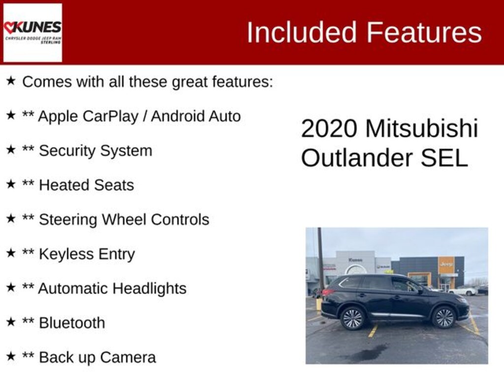Black 2020 Mitsubishi Outlander SEL SEL Comes with all these great features:, ** Apple CarPlay / Android Auto, ** Security System, ** Heated Seats, ** Steering Wheel Controls, ** Keyless Entry, ** Automatic Headlights, ** Bluetooth, ** Back up Camera, **Rear Park Assist, **SIRIUS XM, 4D Sport Utility, Black, ABS brakes, Alloy wheels, Electronic Stability Control, Front dual zone A/C, Heated door mirrors, Heated Front Bucket Seats, Heated front seats, Illuminated entry, Leather Seat Trim, Low tire pressure warning, Power Liftgate, Remote keyless entry, Traction control. Recent Arrival!