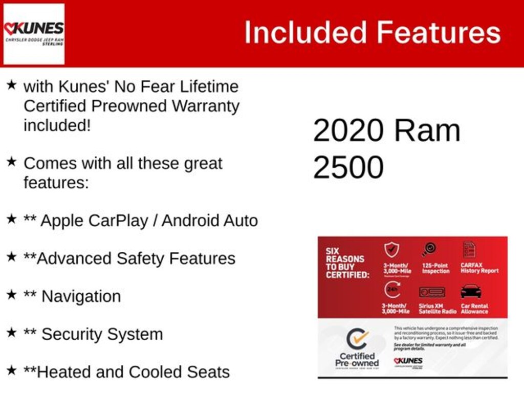 As a Kunes' No Fear Lifetime Certified Preowned vehicle, this Ram 2500 Laramie comes with the assurance of a 125-point inspection, roadside assistance, and a comprehensive warranty. You can drive with confidence, knowing this truck has been meticulously reconditioned using authentic Mopar parts.