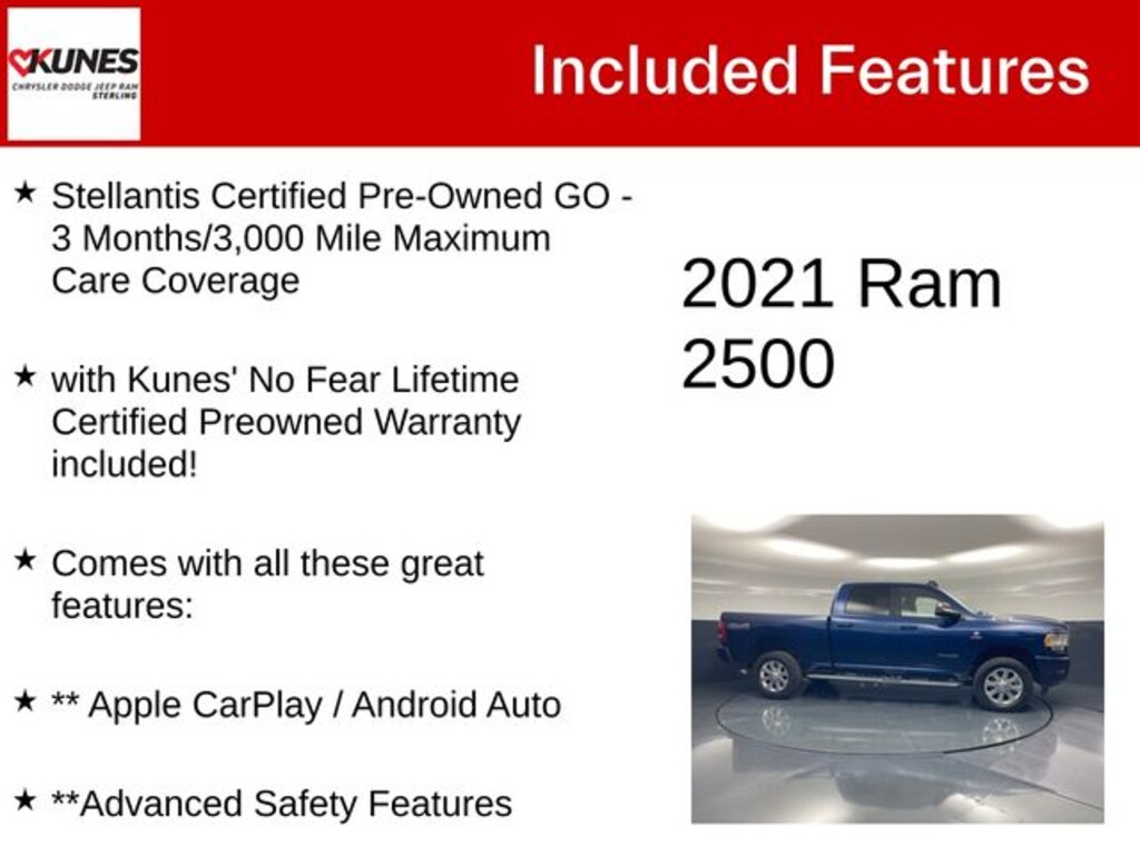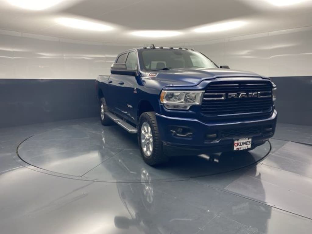 Patriot Blue Pearlcoat 2021 Ram 2500 Big Horn Big Horn Stellantis Certified Pre-Owned GO - 3 Months/3,000 Mile Maximum Care Coverage, with Kunes' No Fear Lifetime Certified Preowned Warranty included!, Comes with all these great features:, ** Apple CarPlay / Android Auto, **Advanced Safety Features, ** Navigation, ** Security System, ** Heated Seats, **Heated Steering wheel, ** Steering Wheel Controls, ** Premium Wheels, ** Keyless Entry, ** Automatic Headlights, ** Bluetooth, ** Back up Camera, **Rear Park Assist, **SIRIUS XM, Remote Start, 115V Auxiliary Rear Power Outlet, 2 Way Rear Headrest Seat, 20" x 8.0" Polished Aluminum Wheels, 2nd Row In Floor Storage Bins, 4 Way Front Headrests, 40/20/40 Split Bench Seat, 4G LTE Wi-Fi Hot Spot, 5-Year SiriusXM Traffic Service, 5-Year SiriusXM Travel Link Service, 9 Alpine Speakers w/Subwoofer, Active Noise Control System, Apple CarPlay, Auto-Dimming Rear-View Mirror, Big Horn IP Badge, Black Interior Accents, Body Color Grille Surround, Bumpers: chrome, Center Hub, Center Stack Storage Drawer, Chrome Flat Wheel-to-Wheel Side Steps, Cloth 40/20/40 Bench Seat, Cluster 7.0" TFT Color Display, Dampened Tailgate, Delay-off headlights, Driver door bin, Dual Glove Boxes, Electronically Controlled Throttle, Exterior 115V AC Outlet, Foam Bottle Insert (Door Trim Panel), Folding Flat Load Floor Storage, Footwell Courtesy Lamp, Front anti-roll bar, Front Armrest w/Cupholders, Front Center Armrest w/Storage, Front Fog Lamps, Front Performance Tuned Shock Absorbers, Front reading lights, Fully automatic headlights, Glove Box Lamp, Google Android Auto, GPS Antenna Input, GPS Navigation, HD Radio, Hill Descent Control, Illuminated entry, Integrated Center Stack Radio, Integrated Voice Command w/Bluetooth, Locking Lower Glove Box, Low tire pressure warning, Manual Adjust 4-Way Front Passenger Seat, Media Hub w/2 Charge Only USBs, MOPAR Deployable Bed Step, MOPAR Front & Rear Rubber Floor Mats, MOPAR Spray In Bedliner, Occupant sensing airbag, Off Road Decal, Outside temperature display, Overhead airbag, Overhead console, Painted Front Bumper, Painted Rear Bumper, Panic alarm, ParkSense Front/Rear Park Assist System, ParkView Rear Back-Up Camera, Passenger vanity mirror, Power 2-Way Driver Lumbar Adjust, Power Adjust 8-Way Driver Seat, Power door mirrors, Premium Cloth 40/20/40 Bench Seat, Radio data system, Radio: Uconnect 3 w/5" Display, Radio: Uconnect 4C Nav w/8.4" Display, Rear 60/40 Folding Seat, Rear anti-roll bar, Rear Dome w/On/Off Switch Lamp, Rear Folding Seat, Rear Performance Tuned Shock Absorbers, Rear Power Sliding Window, Rear seat center armrest, Rear step bumper, Rear Wheelhouse Liners, Remote Start System, SiriusXM Satellite Radio, Speed control, Sport Decal, Sun Visors w/Illuminated Vanity Mirrors, Tip Start, Turn signal indicator mirrors, Vendor Painted Cargo Box Tracking, Voltmeter, Wheels: 18" x 8.0" Polished Aluminum, Wheels: 18" x 8.0" Steel Chrome Clad. Recent Arrival!