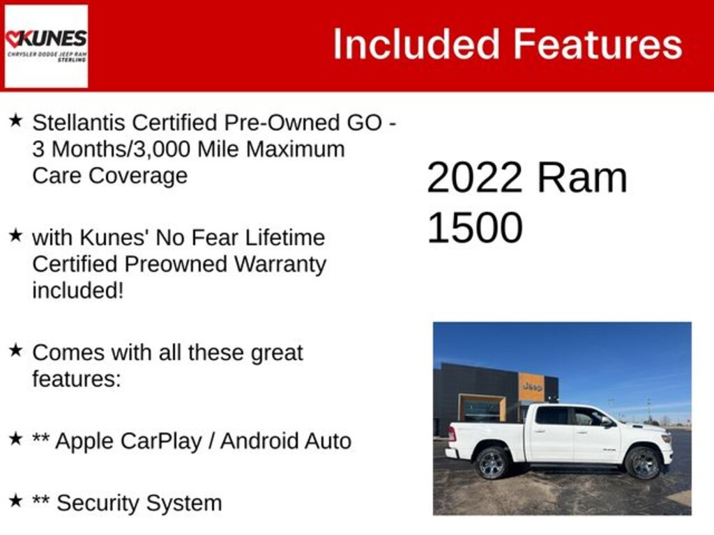 Bright White Clearcoat 2022 Ram 1500 Big Horn/Lone Star Big Horn/Lone Star Stellantis Certified Pre-Owned GO - 3 Months/3,000 Mile Maximum Care Coverage, with Kunes' No Fear Lifetime Certified Preowned Warranty included!, Comes with all these great features:, ** Apple CarPlay / Android Auto, ** Security System, ** Heated Seats, **Heated Steering wheel, ** Steering Wheel Controls, ** Keyless Entry, ** Automatic Headlights, ** Bluetooth, ** Back up Camera, **Rear Park Assist, **SIRIUS XM, Remote Start, 1500 Big Horn/Lone Star, 4D Crew Cab, HEMI 5.7L V8 Multi Displacement VVT, 4WD, Bright White Clearcoat, Black Cloth, 115V Auxiliary Power Outlet, 2nd Row In Floor Storage Bins, 3 Rear Seat Head Restraints, 4 Way Front Headrests, 400W Inverter, 6 Speakers, Air Conditioning ATC w/Dual Zone Control, All Plant-Installed Decals, Auto-Dimming Exterior Driver Mirror, Big Horn Badge, Big Horn Level 2 Equipment Group, Black Interior Accents, Black Premium Power Mirrors, Body Color Exterior Mirrors, Body Color Premium Power Mirrors, Body Color Rear Bumper w/Step Pads, Bumpers: chrome, Cloth Bench Seat, Compass, Convex Wide-Angle Mirror Insert, Emergency communication system: SiriusXM Guardian, Exterior Mirrors Courtesy Lamps, Front Center Armrest w/Storage, Front Seat Back Map Pockets, Global Telematics Box Module (TBM), Glove Box Lamp, Manual Adjust 4-Way Front Passenger Seat, MOPAR Front & Rear Rubber Floor Mats, Outside temperature display, ParkSense Front/Rear Park Assist w/Stop, Passenger door bin, Power 2-Way Driver Lumbar Adjust, Quick Order Package 27Z Big Horn, Radio: Uconnect 3 w/5" Display, Rear Center Armrest, Rear Dome w/On/Off Switch Lamp, Rear Power Sliding Window, Rear step bumper, Remote Start System, Split folding rear seat, Sport Appearance Package, Sport Decal, USB Host Flip, Variably intermittent wipers, Voltmeter, Wheels: 20" x 9" Aluminum Chrome Clad (WRK).