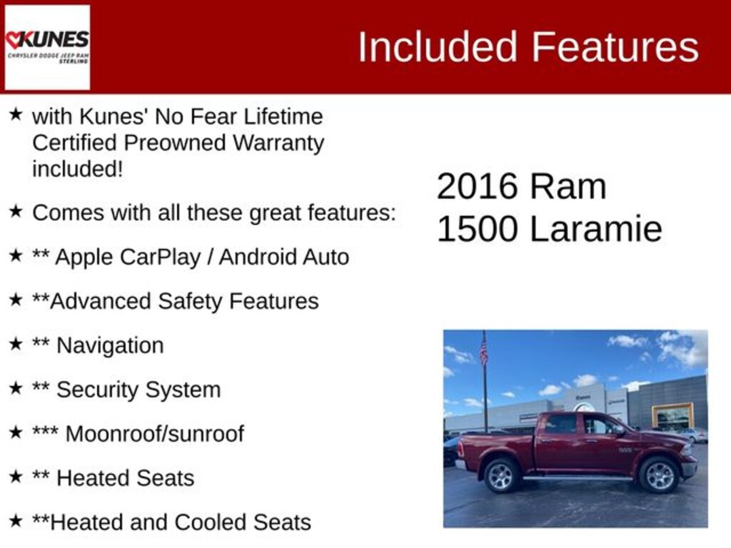Delmonico Red Pearlcoat 2016 Ram 1500 Laramie Laramie Comes with all these great features:, ** Apple CarPlay / Android Auto, **Advanced Safety Features, ** Navigation, ** Security System, *** Moonroof/sunroof, ** Heated Seats, **Heated and Cooled Seats, **Heated Steering wheel, ** Steering Wheel Controls, ** Premium Wheels, ** Keyless Entry, ** Automatic Headlights, ** Bluetooth, ** Back up Camera, **Rear Park Assist, **SIRIUS XM, Remote Start, 1500 Laramie, 4D Crew Cab, Delmonico Red Pearlcoat, Light Frost Beige/Canyon Brown w/Leather Trim 40/20/40 Bench Seat or Leather Trimmed Bucket Seats. Recent Arrival!