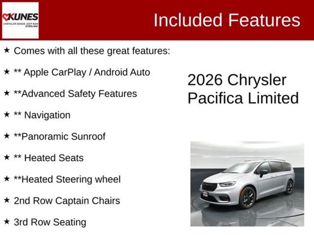 The 2026 Pacifica gives you all the passenger and storage space you need along with a fantastic 28 MPG highway! Also included with every new vehicle: LIFETIME "NO FEAR" WARRANTY, FIRST OIL CHANGE, and AT HOME COURTESY DELIVERY! Call us for full details! We pride ourselves on honesty and integrity, but please note that mistakes or misprints due to human error are possible. Find out why our dealerships have won DealerRater.com DEALER OF THE YEAR a whopping 10 TIMES! Call, email, or live chat with one of our friendly sales professionals now to schedule your test drive! Prices shown do not include taxes, license, and title fees and a $377.63 documentary service fee. Price includes: $3500 - 2026 National Retail Bonus Cash . Exp. 03/31/2026 $500 - 2026 Midwest BC Retail Bonus Cash . Exp. 03/31/2026