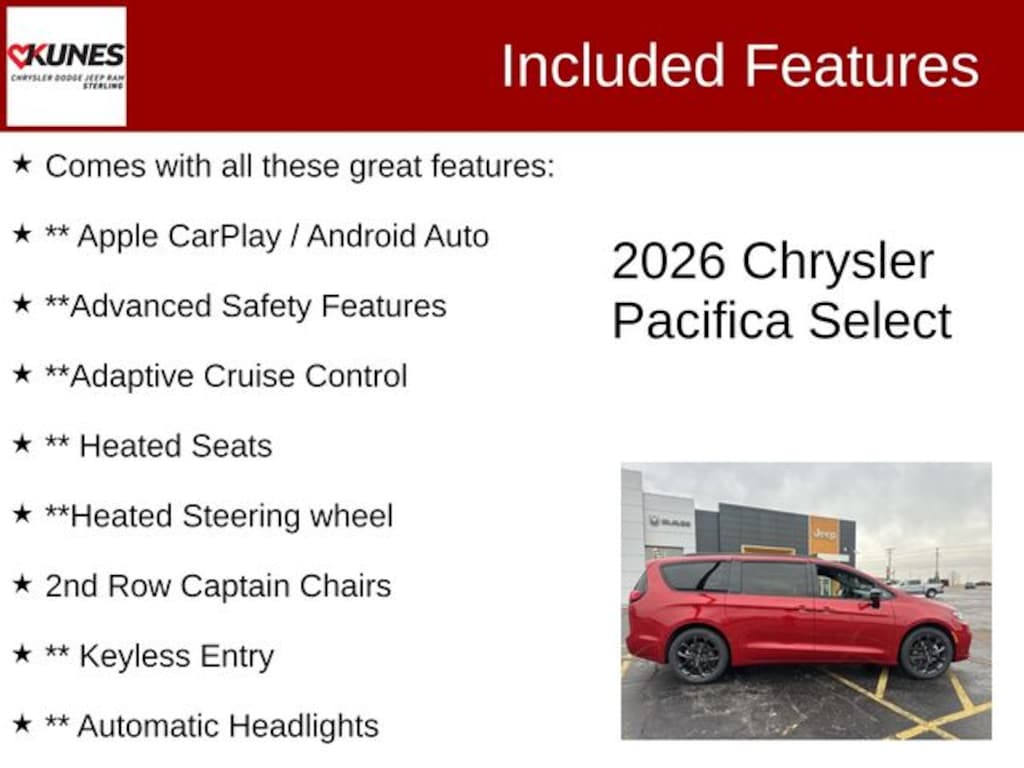 Red Hot Pearlcoat 2026 Chrysler Pacifica Select FWD 9-Speed 948TE Automatic 3.6L V6 24V VVT Comes with all these great features:, ** Apple CarPlay / Android Auto, **Advanced Safety Features, **Adaptive Cruise Control, ** Heated Seats, **Heated Steering wheel, 2nd Row Captain Chairs, ** Keyless Entry, ** Automatic Headlights, ** Bluetooth, ** Back up Camera, **Rear Park Assist, **SIRIUS XM, Remote Start, Removable Seats, Pacifica Select, 4D Passenger Van, 3.6L V6 24V VVT, 9-Speed 948TE Automatic, FWD, Red Hot Pearlcoat, Black w/Caprice Leatherette with S Logo Or Caprice Leatherette Bucket Seats, Quick Order Package 27L, S Appearance Package, 10.1" Touchscreen Display, 17" x 7.0" Aluminum Wheels, 3.25 Axle Ratio, 3rd row seats: split-bench, 4-Wheel Disc Brakes, 4G LTE Wi-Fi Hot Spot, 6 Speakers, ABS brakes, Air Conditioning, Alloy wheels, AM/FM radio: SiriusXM, Anodized Ink Badging, Apple CarPlay, Apple CarPlay/Android Auto, Auto-dimming Rear-View mirror, Automatic temperature control, Black Day Light Opening Moldings, Black Seats, Black Stow 'N Place Roof Rack, Brake assist, Bumpers: body-color, Caprice Leatherette Bucket Seats, Caprice Leatherette with S Logo, Compass, Connectivity - US/Canada, Delay-off headlights, Disassociated Touchscreen Display, Driver door bin, Driver vanity mirror, Driver's Seat Mounted Armrest, Dual front impact airbags, Dual front side impact airbags, Electronic Stability Control, Emergency communication system: Chrysler Connect, For Details, Visit DriveUconnect.com, Four wheel independent suspension, Front anti-roll bar, Front Bucket Seats, Front dual zone A/C, Front fog lights, Front reading lights, Fully automatic headlights, Garage door transmitter, Google Android Auto, GPS Antenna Input, Heated door mirrors, Heated front seats, Heated steering wheel, Illuminated entry, Integrated Active Noise Cancellation, Integrated Center Stack Radio, Knee airbag, Low tire pressure warning, Memory seat, MyFlexCare Service Plan, Occupant sensing airbag, Outside temperature display, Overhead airbag, Overhead console, Panic alarm, ParkView Rear Back-Up Camera, Passenger door bin, Passenger seat mounted armrest, Passenger vanity mirror, Piano Black Interior Accents, Power door mirrors, Power driver seat, Power Liftgate, Power steering, Power windows, Premium Fascia Upper/Lower Grille with Black Surround, Premium Rear Fascia Black, Radio data system, Radio: Uconnect 5 with 10.1" Display, Rain sensing wipers, Rear air conditioning, Rear reading lights, Rear window defroster, Rear window wiper, Reclining 3rd row seat, Remote keyless entry, S Badge, Security system, Speed control, Split folding rear seat, Spoiler, Steering wheel mounted audio controls, Tachometer, Telescoping steering wheel, Tilt steering wheel, Touring Suspension, Traction control, Trip computer, Turn signal indicator mirrors, USB Host Flip, Variably intermittent wipers, Voltmeter, Wheels: 20" x 7.5" S-Model Aluminum Design 1, Pacifica Select, 4D Passenger Van, 3.6L V6 24V VVT, 9-Speed 948TE Automatic, FWD, Red Hot Pearlcoat, Black w/Caprice Leatherette with S Logo Or Caprice Leatherette Bucket Seats, Quick Order Package 27L, S Appearance Package.