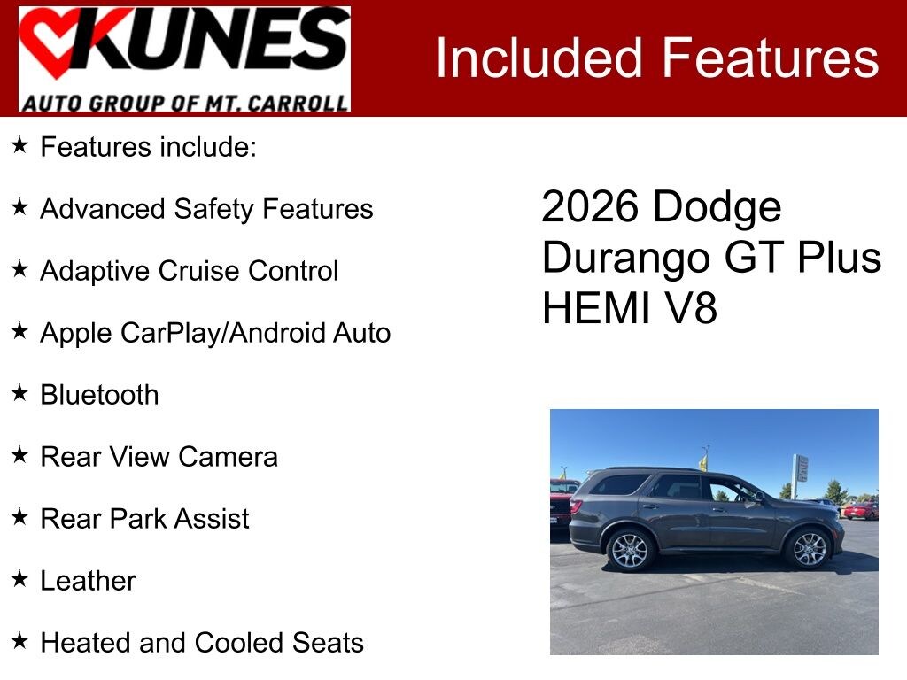 Advanced Safety Features, Adaptive Cruise Control, Apple CarPlay/Android Auto, Bluetooth, Rear View Camera, Rear Park Assist, Leather, Heated and Cooled Seats, 3rd Row Seating, Keyless Entry, Keyless Ignition, Remote Start, Navigation/GPS/NAVI, Sirius/XM, Sunroof/Moonroof, Collision Avoidance, Power Lift Gate, Steering Wheel Controls, Heated Rear Seating, Durango GT, 4D Sport Utility, HEMI 5.7L V8 Multi Displacement VVT, 8-Speed Automatic, AWD, Vapor Gray, Red/Black/Ebony Leather, 115V Auxiliary Power Outlet, 160 mph Primary Speedometer, 7 & 4 Pin Wiring Harness, Active Noise Control System, Adaptive Cruise Control w/Stop, Adaptive Damping, Auto High Beam Headlamp Control, Auto-Dimming Exterior Driver Mirror, Automatic Headlamp Leveling System, Black Brake Calipers, Black Roof Rails, Blind Spot w/Trailer Detection, Body Color Upper & Lower Rear Fascia, Brembo Brakes, Class IV Receiver Hitch, Drive Modes - Sport/Track/Tow/Snow, Dual Remote USB Port - Charge Only, Electronic Limited Slip Differential Rear Axle, Exterior Mirrors w/Heating Element, Exterior Mirrors w/Memory, Exterior Mirrors w/Supplemental Signals, Floor Console w/Leather Armrest, Full Speed Forward Collision Warning Plus, Gloss Black Exterior Mirrors, Heated Second Row Seats, High Performance Exhaust, High Performance Suspension, Integrated Roof Rail Crossbars, Leather Trimmed Bucket Seats, Leather Wrapped Door Panels, LED Auxiliary Low Beam & Turn Signal, Navigation System, Performance Tuned Steering, Power 6x9 Multi-Function Foldaway Mirrors, Power 8-Way Driver Memory 8-Way Passenger Seats, Power Driver/Passenger 4-Way Lumbar Adjust, Power Sunroof, Power Tilt & Telescopic Steering Column, Quadra-Trac Active on Demand 4WD, Quick Order Package 22T GT Plus, Radio/Driver Seat/Mirrors Memory, Red Accent Stitching, Run Flat Tires, Tow 'N Go Package, Trailer Brake Control, Ventilated Front Seats. 2026 Dodge Durango GT Vapor Gray HEMI 5.7L V8 Multi Displacement VVT