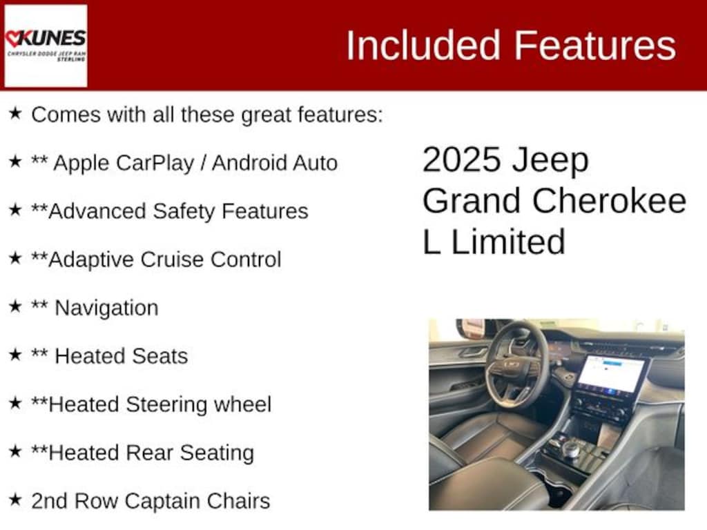 The 2025 Grand Cherokee L can carry all the passengers and cargo you need in style and comfort. Also included with every new vehicle: LIFETIME "NO FEAR" WARRANTY, FIRST OIL CHANGE, and AT HOME COURTESY DELIVERY! Call us for full details! We pride ourselves on honesty and integrity, but please note that mistakes or misprints due to human error are possible. Find out why our dealerships have won DealerRater.com DEALER OF THE YEAR a whopping 10 TIMES! Call, email, or live chat with one of our friendly sales professionals now to schedule your test drive! Prices shown do not include taxes, license, and title fees and a $367.70 documentary service fee. Price includes: $1000 - 2025 National Grand Cherokee Loyalty Retail Bonus Cash . Exp. 11/03/2025 $2000 - 2025 National Retail Bonus Cash . Exp. 11/03/2025 $500 - 2025 National Jeep Monopoly Money Bonus Cash . Exp. 11/03/2025