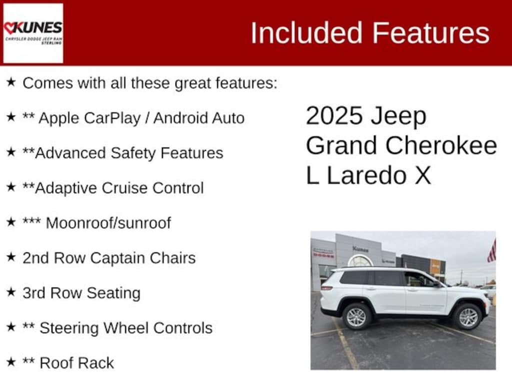 The 2025 Grand Cherokee L can carry all the passengers and cargo you need in style and comfort. Also included with every new vehicle: LIFETIME "NO FEAR" WARRANTY, FIRST OIL CHANGE, and AT HOME COURTESY DELIVERY! Call us for full details! We pride ourselves on honesty and integrity, but please note that mistakes or misprints due to human error are possible. Find out why our dealerships have won DealerRater.com DEALER OF THE YEAR a whopping 10 TIMES! Call, email, or live chat with one of our friendly sales professionals now to schedule your test drive! Prices shown do not include taxes, license, and title fees and a $377.63 documentary service fee. Price includes: $2500 - 2025 National Retail Bonus Cash . Exp. 03/02/2026