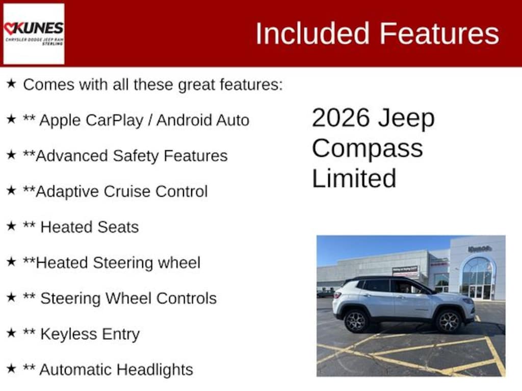 Silver Zynith Metallic Clearcoat 2026 Jeep Compass Limited 4WD 8-Speed Automatic 2.0L I4 DOHC Comes with all these great features:, ** Apple CarPlay / Android Auto, **Advanced Safety Features, **Adaptive Cruise Control, ** Heated Seats, **Heated Steering wheel, ** Steering Wheel Controls, ** Keyless Entry, ** Automatic Headlights, ** Bluetooth, ** Back up Camera, **SIRIUS XM, Remote Start, Compass Limited, 4D Sport Utility, 2.0L I4 DOHC, 8-Speed Automatic, 4WD, Silver Zynith Metallic Clearcoat, Black Artificial Leather, 3.73 Final Drive Ratio, 4-Wheel Disc Brakes, 6 Speakers, ABS brakes, Air Conditioning, Alloy wheels, Auto High-beam Headlights, Auto-dimming Rear-View mirror, Automatic temperature control, Brake assist, Compass, Delay-off headlights, Driver door bin, Driver vanity mirror, Dual front impact airbags, Dual front side impact airbags, Electronic Stability Control, Four wheel independent suspension, Front anti-roll bar, Front Bucket Seats, Front dual zone A/C, Front fog lights, Front reading lights, Fully automatic headlights, Heated door mirrors, Heated front seats, Heated steering wheel, Illuminated entry, Knee airbag, Leather Shift Knob, Leather steering wheel, Leatherette Seats, Low tire pressure warning, Occupant sensing airbag, Outside temperature display, Overhead airbag, Overhead console, Panic alarm, ParkView Rear Back-Up Camera, Passenger door bin, Passenger vanity mirror, Power door mirrors, Power driver seat, Power Liftgate, Power steering, Power windows, Radio: Uconnect 5 w/10.1" Display, Rain sensing wipers, Rear anti-roll bar, Rear window defroster, Rear window wiper, Remote keyless entry, Security system, Speed control, Split folding rear seat, Spoiler, Steering wheel mounted audio controls, Tachometer, Telescoping steering wheel, Tilt steering wheel, Traction control, Turn signal indicator mirrors, Variably intermittent wipers, Wheels: 18" x 7" Painted Diamond Cut Aluminum, Compass Limited, 4D Sport Utility, 2.0L I4 DOHC, 8-Speed Automatic, 4WD, Silver Zynith Metallic Clearcoat, Black Artificial Leather.