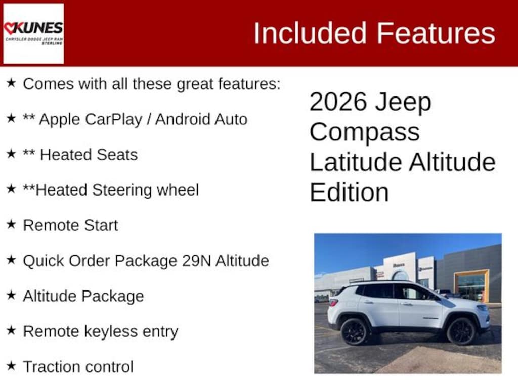 Bright White Clearcoat 2026 Jeep Compass Altitude 4WD 8-Speed Automatic 2.0L I4 DOHC Comes with all these great features:, ** Apple CarPlay / Android Auto, ** Heated Seats, **Heated Steering wheel, Remote Start, Compass Altitude, 4D Sport Utility, 2.0L I4 DOHC, 8-Speed Automatic, 4WD, Bright White Clearcoat, Black Cloth, 10.1" Touchscreen Display, ABS brakes, Altitude Package, Altitude Special Edition, Black Day Light Opening Moldings, Compass, Electronic Stability Control, Front License Plate Bracket, Gloss Black Surround/Neutral Gray Rings, Heated door mirrors, Heated front seats, Illuminated entry, Low tire pressure warning, Neutral Gray Exterior Badging, ParkView Rear Back-Up Camera, Passenger door bin, Piano Black Interior Accents, Quick Order Package 29N Altitude, Remote keyless entry, Sliding Sun Visors with Illuminated Mirrors, Traction control, Wheels: 18" x 7" Gloss Black Painted Aluminum.
