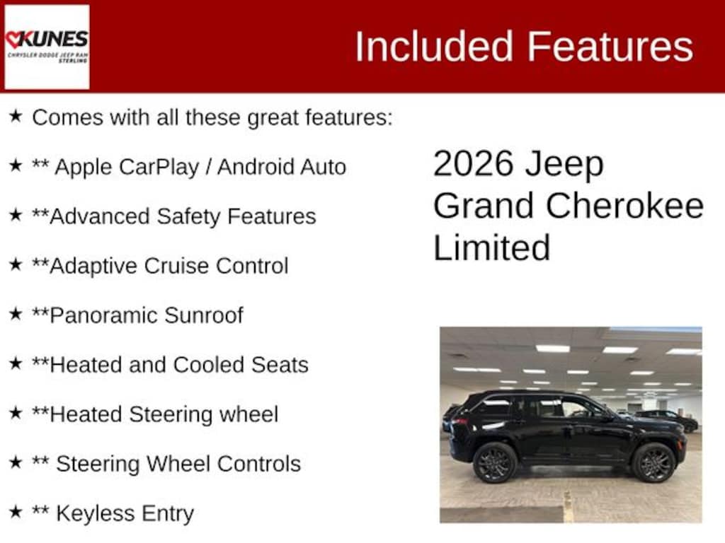 Diamond Black Crystal Pearlcoat 2026 Jeep Grand Cherokee Limited 4WD 8-Speed Automatic 2.0L I4 PDI Turbocharged DOHC 16V LEV3-SULEV30 324hp Comes with all these great features:, ** Apple CarPlay / Android Auto, **Advanced Safety Features, **Adaptive Cruise Control, **Panoramic Sunroof, **Heated and Cooled Seats, **Heated Steering wheel, ** Steering Wheel Controls, ** Keyless Entry, ** Automatic Headlights, ** Bluetooth, ** Back up Camera, **Rear Park Assist, **SIRIUS XM, Remote Start, Grand Cherokee Limited, 4D Sport Utility, 2.0L I4 PDI Turbocharged DOHC 16V LEV3-SULEV30 324hp, 8-Speed Automatic, 4WD, Diamond Black Crystal Pearlcoat, Global Black Leather, Navigation System, Quick Oder Package 2CR Limited Reserve, Trailer Tow Package, 10 Speakers, 3.70 Rear Axle Ratio, 4-Wheel Disc Brakes, 4G LTE Wi-Fi Hot Spot, 7 and 4-Pin Wiring Harness, ABS brakes, Active Noise Control System, Air Conditioning, Alloy wheels, AM/FM radio: SiriusXM with 360L, Anti-whiplash front head restraints, Apple CarPlay, AppLink/Apple CarPlay and Android Auto, Audio memory, Auto High-beam Headlights, Auto-Dimming Exterior Driver Mirror, Automatic temperature control, Auxiliary Battery, Brake assist, Bumpers: body-color, Capri Leatherette Seats, Class IV Receiver Hitch, Compass, Connectivity - US/Canada, Delay-off headlights, Delete Limited Badge, Disassociated Touchscreen Display, Driver door bin, Driver vanity mirror, Dual front impact airbags, Dual front side impact airbags, Dual-Pane Panoramic Sunroof, Electronic Stability Control, Emergency communication system, Exterior Accents Dark Neutral Metallic, For Details, Visit DriveUconnect.com, Four wheel independent suspension, Front anti-roll bar, Front Bucket Seats, Front Center Armrest w/Storage, Front dual zone A/C, Front fog lights, Front License Plate Bracket, Front reading lights, Fully automatic headlights, Garage door transmitter, Global Telematics Box Module (TBM), Gloss Black Exterior Mirrors, Gloss Black Roof Rails, Google Android Auto, GPS Antenna Input, Heated door mirrors, Heated Exterior Mirrors, Heated front seats, Heated rear seats, Heated steering wheel, Illuminated entry, Integrated Center Stack Radio, Integrated Off-Road Camera, Integrated Voice Command with Bluetooth, Knee airbag, Limited Reserve, Low tire pressure warning, Manual Folding Exterior Mirrors, Memory seat, Memory Steering Column, MyFlexCare Service Plan, Nappa Leather Door Trim, Nappa Leather Seats, Normal Duty Suspension, Occupant sensing airbag, Outside temperature display, Overhead airbag, Overhead console, Painted Door Cladding, Painted Lower Front Fascia, Painted Lower Rear Fascia, Painted Lower Rocker Panel Cladding, Painted Wheel Flares, Panic alarm, ParkSense Front/Rear Park Assist with Stop, ParkView Rear Back-Up Camera, Passenger door bin, Passenger vanity mirror, Passive Entry - Front/Rear Doors, Liftgate, Power door mirrors, Power driver seat, Power Liftgate, Power passenger seat, Power steering, Power Tilt/Telescope Steering Column, Power windows, Radio data system, Radio: Uconnect 5 Nav with 12.3" Display, Rain Sensitive Windshield Wipers, Rear anti-roll bar, Rear Back-Up Camera Washer, Rear Load Levelling Suspension, Rear reading lights, Rear window defroster, Rear window wiper, Rearview Autodim Digital Display Mirror, Remote keyless entry, Security system, Side Distance Warning, Speed control, Speed-Sensitive Wipers, Split folding rear seat, Spoiler, Steering wheel mounted audio controls, Surround View Camera System, Tachometer, Telescoping steering wheel, Tilt steering wheel, Traction control, Trailer Hitch Zoom, Trip computer, Turn signal indicator mirrors, Upper Grille Texture C, USB Host Flip, Variably intermittent wipers, Ventilated Front Seats, Voltmeter, Wheels: 18" x 8.0" Polished/Painted Aluminum, Wheels: 20" x 8.5" Black Painted Aluminum, Wireless Charging Pad, Grand Cherokee Limited, 4D Sport Utility, 2.0L I4 PDI Turbocharged DOHC 16V LEV3-SULEV30 324hp, 8-Speed Automatic, 4WD, Diamond Bla