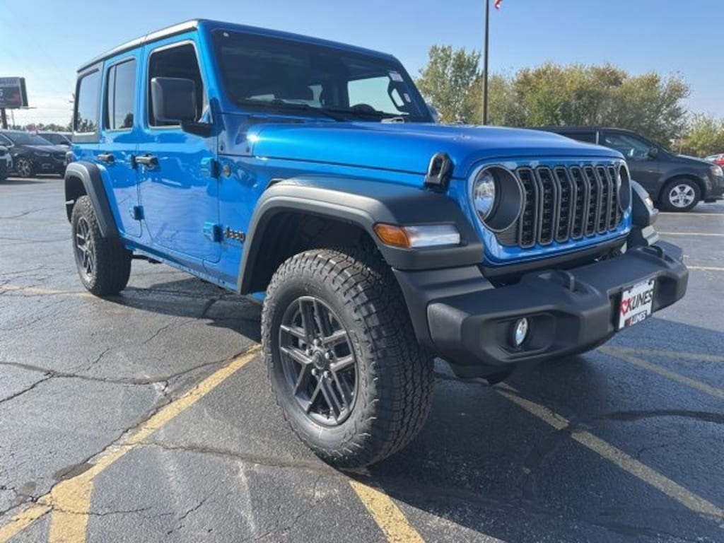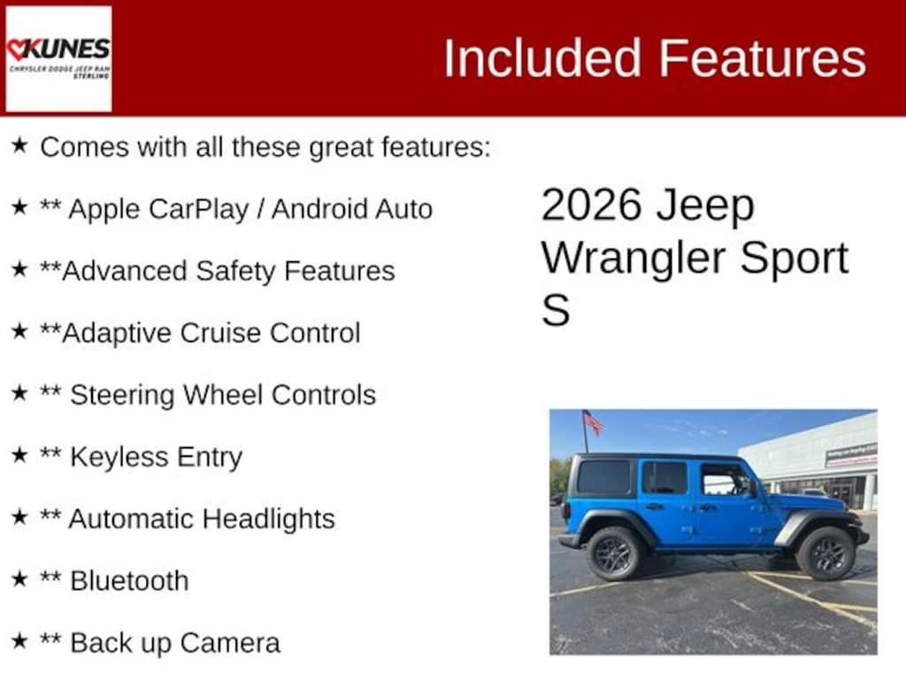 Hydro Blue Pearl Coat 2026 Jeep Wrangler Sport S 4WD 8-Speed Automatic 3.6L V6 24V VVT Comes with all these great features:, ** Apple CarPlay / Android Auto, **Advanced Safety Features, **Adaptive Cruise Control, ** Steering Wheel Controls, ** Keyless Entry, ** Automatic Headlights, ** Bluetooth, ** Back up Camera, **Rear Park Assist, **SIRIUS XM, Wrangler Sport S, 3.6L V6 24V VVT, 8-Speed Automatic, 4WD, Hydro Blue Pearl Coat, Black Cloth, ABS brakes, Compass, Electronic Stability Control, Illuminated entry, Low tire pressure warning, ParkView Rear Back-Up Camera, Remote keyless entry, Traction control, 3.45 Overall Top Gear Ratio, 4-Wheel Disc Brakes, 8 Speakers, Air Conditioning, AM/FM radio: SiriusXM with 360L, Apple CarPlay/Android Auto, Aux Battery, Brake assist, Cloth Low-Back Bucket Seats, Delay-off headlights, Driver door bin, Driver vanity mirror, Dual front impact airbags, Dual front side impact airbags, Front anti-roll bar, Front Bucket Seats, Front Center Armrest w/Storage, Front fog lights, Front reading lights, Integrated roll-over protection, Non-Lock Fuel Cap w/o Discriminator, Normal Duty Suspension, Occupant sensing airbag, Outside temperature display, Overhead airbag, Panic alarm, Passenger door bin, Passenger vanity mirror, Power steering, Power windows, Radio data system, Radio: Uconnect 5 w/12.3" Display, Rear anti-roll bar, Rear reading lights, Speed control, Split folding rear seat, Steering wheel mounted audio controls, Stop-Start Dual Battery System, Tachometer, Telescoping steering wheel, Tilt steering wheel, Trip computer, Variably intermittent wipers, Wheels: 17" x 7.5" Black Steel Styled, Wrangler Sport S, 3.6L V6 24V VVT, 8-Speed Automatic, 4WD, Hydro Blue Pearl Coat, Black Cloth, ABS brakes, Compass, Electronic Stability Control, Illuminated entry, Low tire pressure warning, ParkView Rear Back-Up Camera, Remote keyless entry, Traction control.