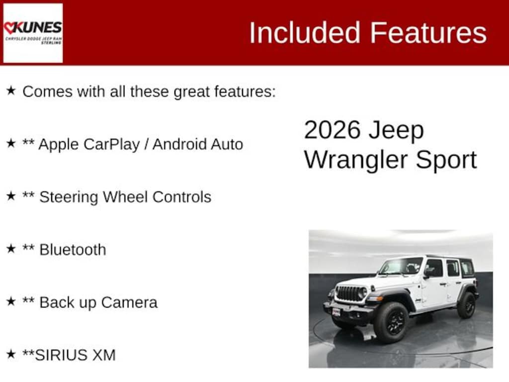 Bright White Clearcoat 2026 Jeep Wrangler Sport 4WD 8-Speed Automatic 3.6L V6 24V VVT Comes with all these great features:, ** Apple CarPlay / Android Auto, ** Steering Wheel Controls, ** Bluetooth, ** Back up Camera, **SIRIUS XM, Wrangler Sport, 4D Sport Utility, 3.6L V6 24V VVT, 8-Speed Automatic, 4WD, Bright White Clearcoat, Black Cloth.