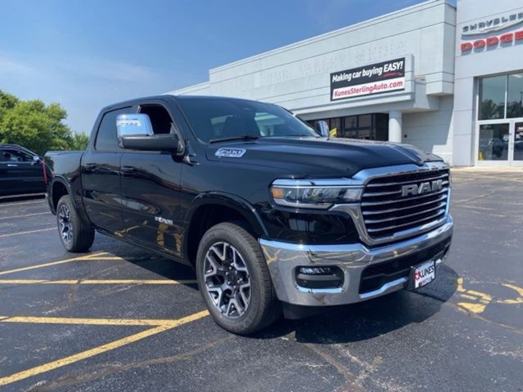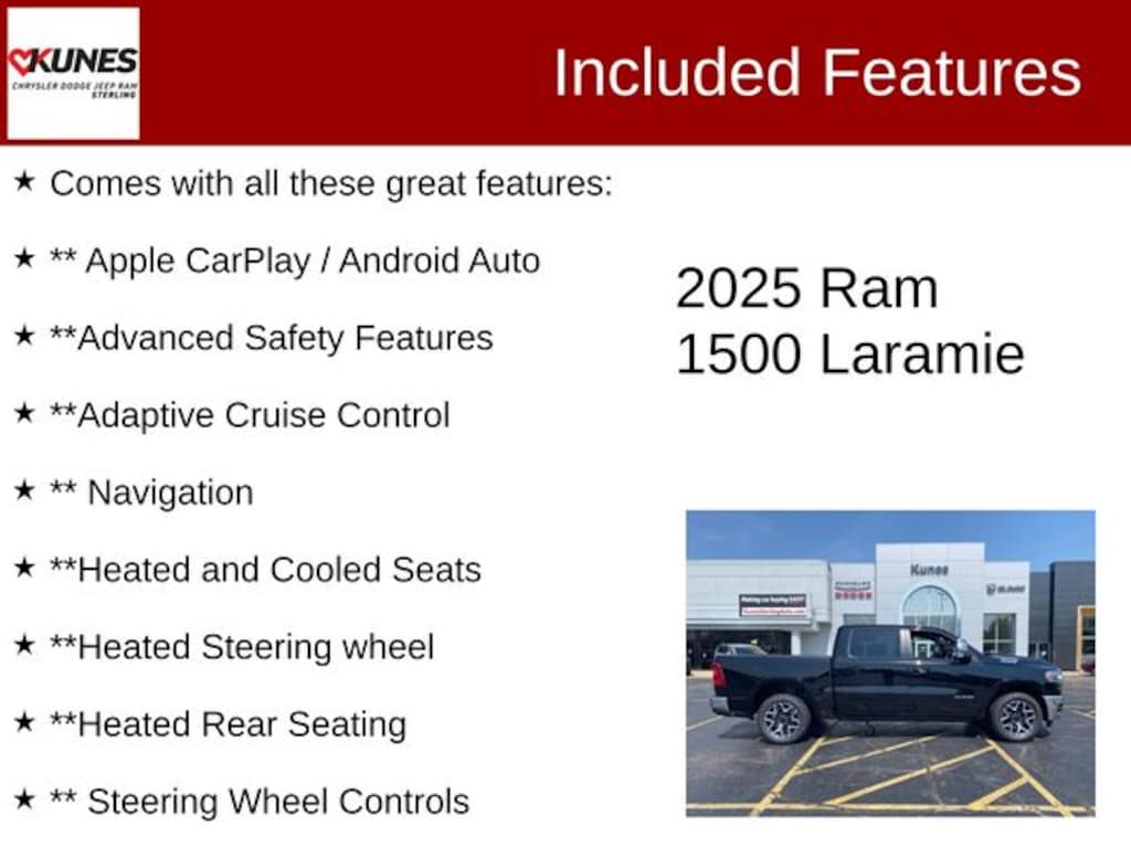 Diamond Black Crystal Pearlcoat 2025 Ram 1500 Laramie 4WD 8-Speed Automatic 3.0L I6 Comes with all these great features:, ** Apple CarPlay / Android Auto, **Advanced Safety Features, **Adaptive Cruise Control, ** Navigation, **Heated and Cooled Seats, **Heated Steering wheel, **Heated Rear Seating, ** Steering Wheel Controls, ** Bluetooth, ** Back up Camera, **Rear Park Assist, **SIRIUS XM, Remote Start, 1500 Laramie, 4D Crew Cab, 3.0L I6, 8-Speed Automatic, 4WD, Diamond Black Crystal Pearlcoat, Black Leather, Laramie Level 2 Equipment Group, Navigation System, Quick Order Package 21H Laramie, Trailer Tow Group.