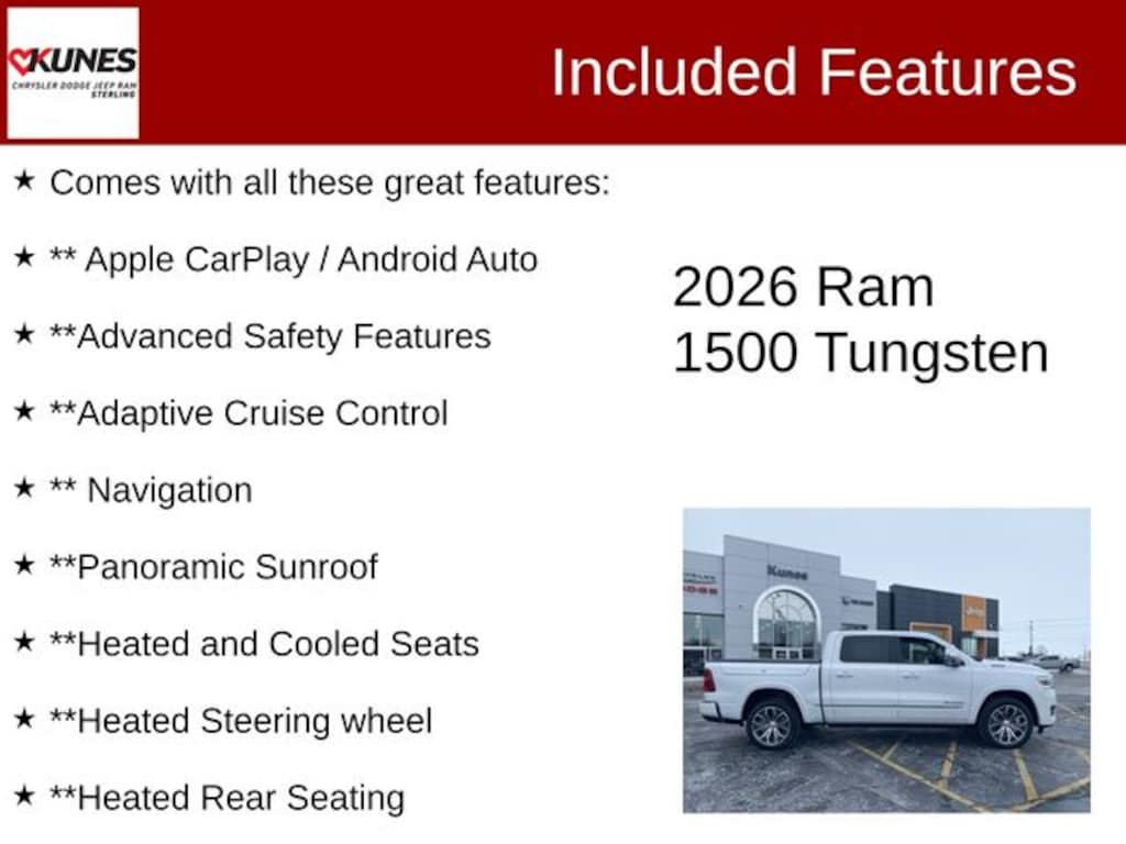 Ivory White Tri-Coat Pearlcoat 2026 Ram 1500 Tungsten 4WD 8-Speed Automatic 3.0L I6 Comes with all these great features:, ** Apple CarPlay / Android Auto, **Advanced Safety Features, **Adaptive Cruise Control, ** Navigation, **Panoramic Sunroof, **Heated and Cooled Seats, **Heated Steering wheel, **Heated Rear Seating, ** Steering Wheel Controls, ** Keyless Entry, ** Bluetooth, ** Back up Camera, **Rear Park Assist, **SIRIUS XM, Remote Start, 1500 Tungsten, 4D Crew Cab, 3.0L I6, 8-Speed Automatic, 4WD, Ivory White Tri-Coat Pearlcoat, Black Leather, Navigation System, Quick Order Package 22V Tungsten, Towing Technology Group, Trailer Tow Group.