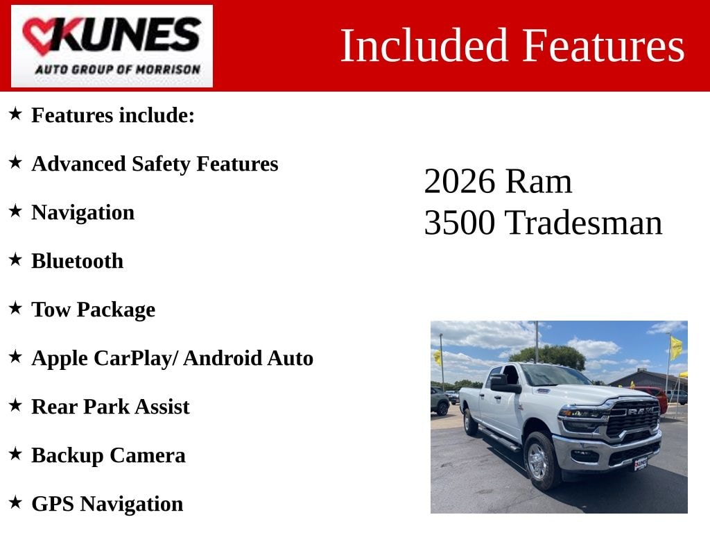 Bright White Clearcoat 2026 Ram 3500 Tradesman Features include:, Advanced Safety Features, Navigation, Bluetooth, Tow Package, Apple CarPlay/ Android Auto, Rear Park Assist, Backup Camera, 3500 Tradesman, 4D Crew Cab, 6.7L I6, 8-Speed Automatic, 4WD, Bright White Clearcoat, Black Cloth, Cold Weather Group, GPS Navigation, Quick Order Package 24A Tradesman, Tradesman Level 2 Equipment Group (DISC). Recent Arrival!