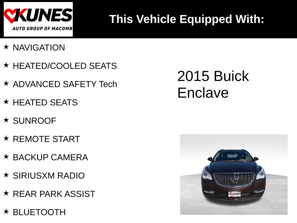 2015 Buick Enclave Premium Group NAVIGATION, HEATED/COOLED SEATS, ADVANCED SAFETY Tech, HEATED SEATS, SUNROOF, REMOTE START, BACKUP CAMERA, SIRIUSXM RADIO, REAR PARK ASSIST, BLUETOOTH, AWD, Bose Performance-Enhanced 10-Speaker System, Radio: Color Touch AM/FM/CD/Nav w/IntelliLink, Rear Audio System Controls, SiriusXM Satellite Radio, Wheels: 20" Ultra Bright Blade Silver Aluminum. Dark Chocolate Metallic