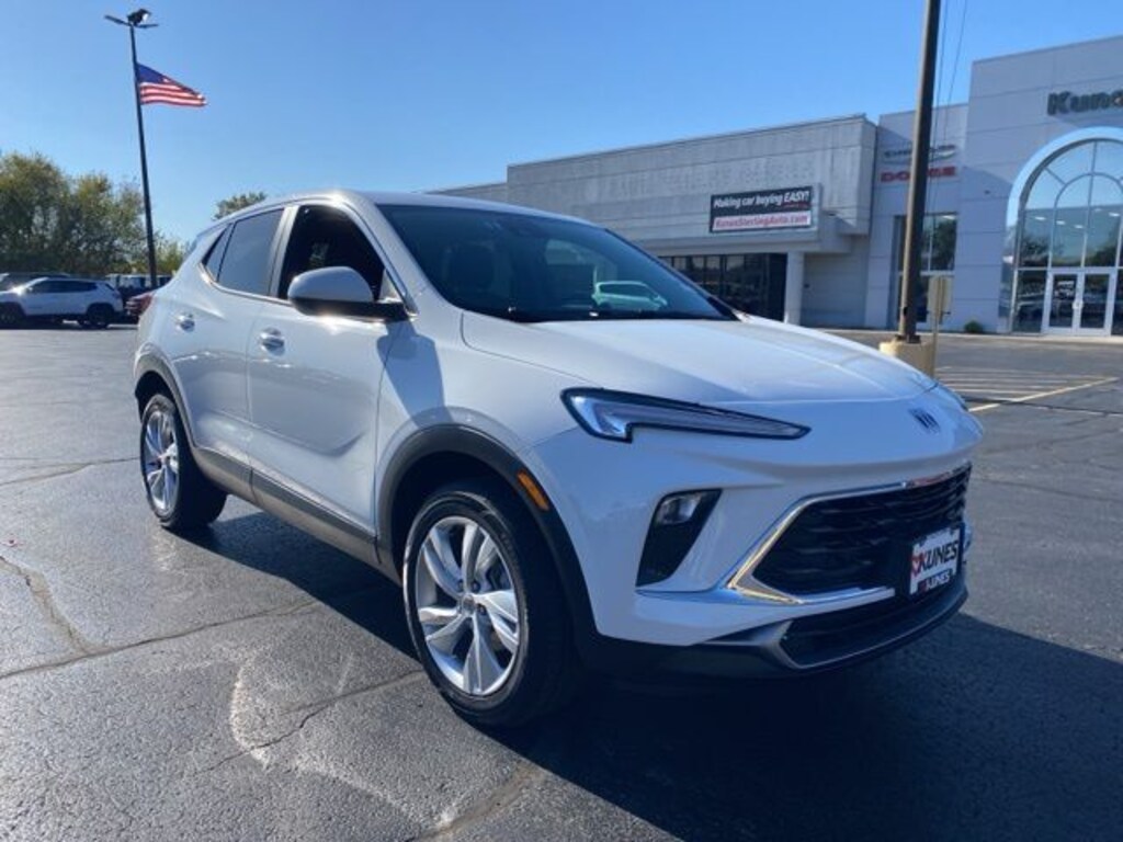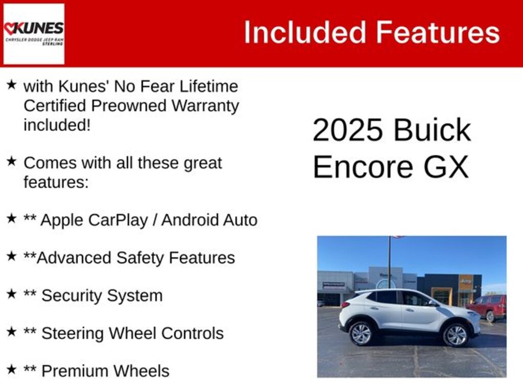 Summit White 2025 Buick Encore GX Preferred Preferred with Kunes' No Fear Lifetime Certified Preowned Warranty included!, Comes with all these great features:, ** Apple CarPlay / Android Auto, **Advanced Safety Features, ** Security System, ** Steering Wheel Controls, ** Premium Wheels, ** Keyless Entry, ** Automatic Headlights, ** Bluetooth, ** Back up Camera, **SIRIUS XM, Remote Start, 2 USB Ports (1 Type-A, 1 Type-C), 4-Way Manual Passenger Seat Adjuster, 7 Speakers, AM/FM radio: SiriusXM, Automatic temperature control, Brake assist, Delay-off headlights, Emergency communication system: OnStar and Buick connected services capable, Enhanced Performance 7-Speaker System w/Amplifier, Front Bucket Seats, Front Center Armrest, Front wheel independent suspension, Illuminated entry, Low tire pressure warning, Outside temperature display, Overhead airbag, Overhead console, Panic alarm, Passenger vanity mirror, Radio data system, Radio: Audio System w/AM/FM, Rear reading lights, Rear side impact airbag, Ride & Handling Suspension, Speed-sensing steering, Spoiler, Trip computer. Recent Arrival!