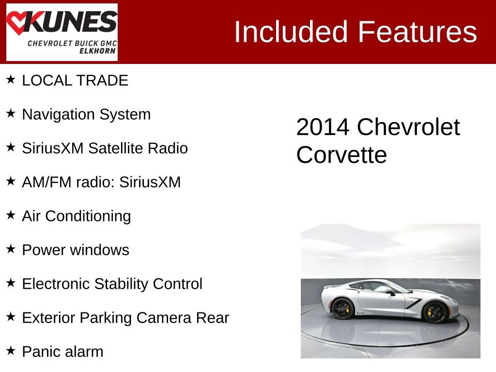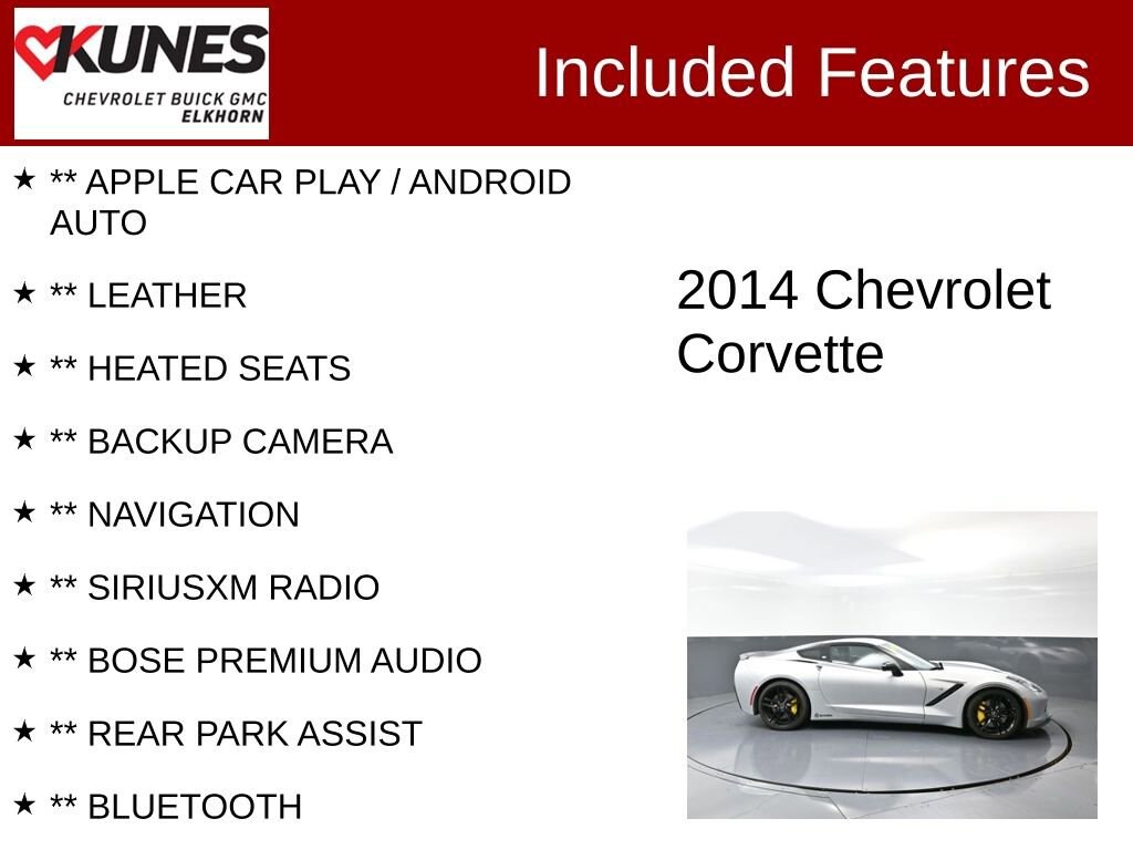 2014 Chevrolet Corvette Stingray Z51 1LT 6.2L V8 7-Speed Manual with Active Rev Matching RWD Clean CARFAX. 17/29 City/Highway MPG