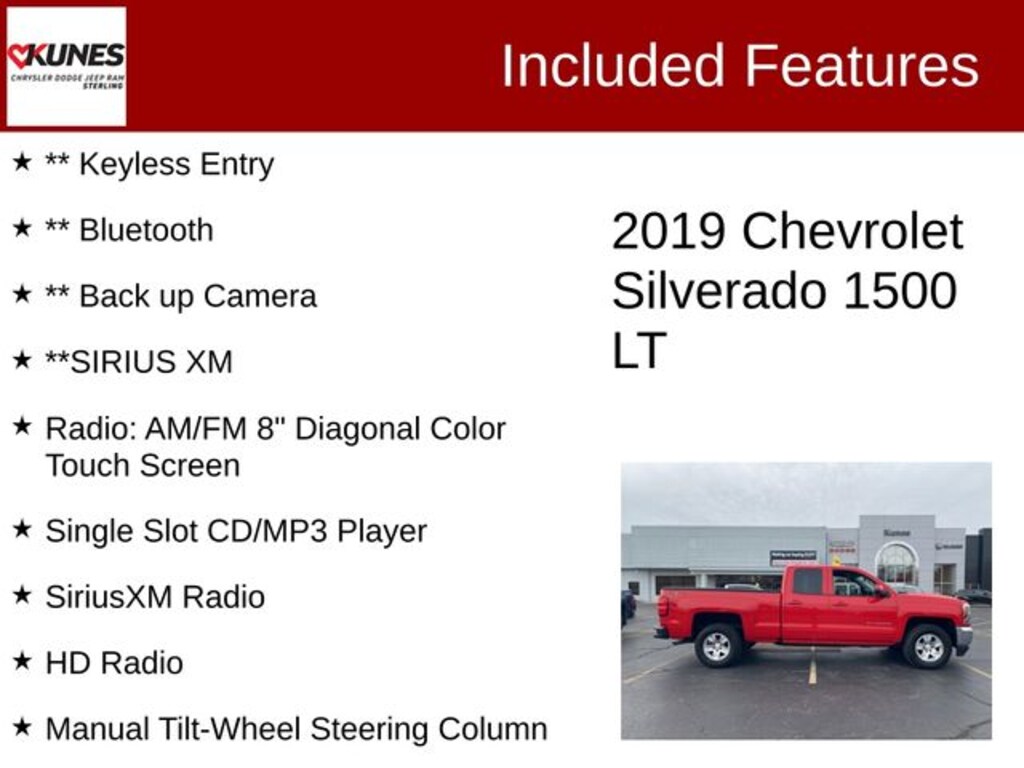 Red Hot 2019 Chevrolet Silverado 1500 LD LT LT Comes with all these great features:, ** Security System, ** Steering Wheel Controls, ** Keyless Entry, ** Automatic Headlights, ** Bluetooth, ** Back up Camera, **SIRIUS XM, Remote Start, Body-Color Power-Adjustable Heated Outside Mirrors, Brake assist, Chevrolet Connected Access, Chrome Rear Bumper, Deep-Tinted Glass, Delay-off headlights, Emergency communication system: OnStar and Chevrolet connected services capable, Front anti-roll bar, Front Center Armrest w/Storage, Front reading lights, Front wheel independent suspension, Fully automatic headlights, HD Radio, Illuminated entry, Manual Tilt-Wheel Steering Column, Occupant sensing airbag, OnStar & Chevrolet Connected Services Capable, Outside temperature display, Overhead airbag, Overhead console, Panic alarm, Radio: AM/FM 8" Diagonal Color Touch Screen, Rear reading lights, Single Slot CD/MP3 Player, SiriusXM Radio, Speed-sensing steering, Split folding rear seat, Thin Profile LED Fog Lamps, Trip computer. Recent Arrival!