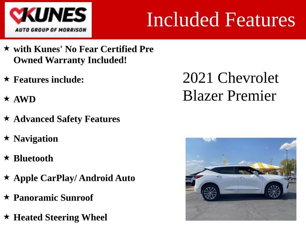 Iridescent Pearl Tricoat 2021 Chevrolet Blazer Pricing includes $2000 Trade In Assistance, and incentive to finance with Dealership. Must trade in 10 year or newer vehicle with less than 100,000 miles. with Kunes' No Fear Certified Pre Owned Warranty Included!, Features include:, AWD, Advanced Safety Features, Navigation, Bluetooth, Apple CarPlay/ Android Auto, Panoramic Sunroof, Heated Steering Wheel, Heated/Cooled Seating, Backup Camera, Blazer Premier, 4D Sport Utility, AWD, Iridescent Pearl Tricoat, Jet Black Leather, Adaptive Cruise Control, Driver Confidence II Package, Enhanced Automatic Emergency Braking, HD Surround Vision, Heavy-Duty Cooling System, Hitch Guidance, Hitch Guidance w/Hitch View, LED Headlamps, Navigation System, Preferred Equipment Group 0HD, Rear Camera Mirror, Rear Camera Mirror Washer, Safety Alert Seat, Trailering Equipment, Wireless Charging. Recent Arrival! Odometer is 35140 miles below market average! Priced below KBB Fair Purchase Price!