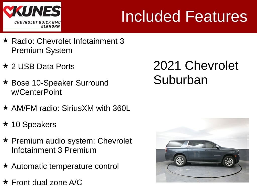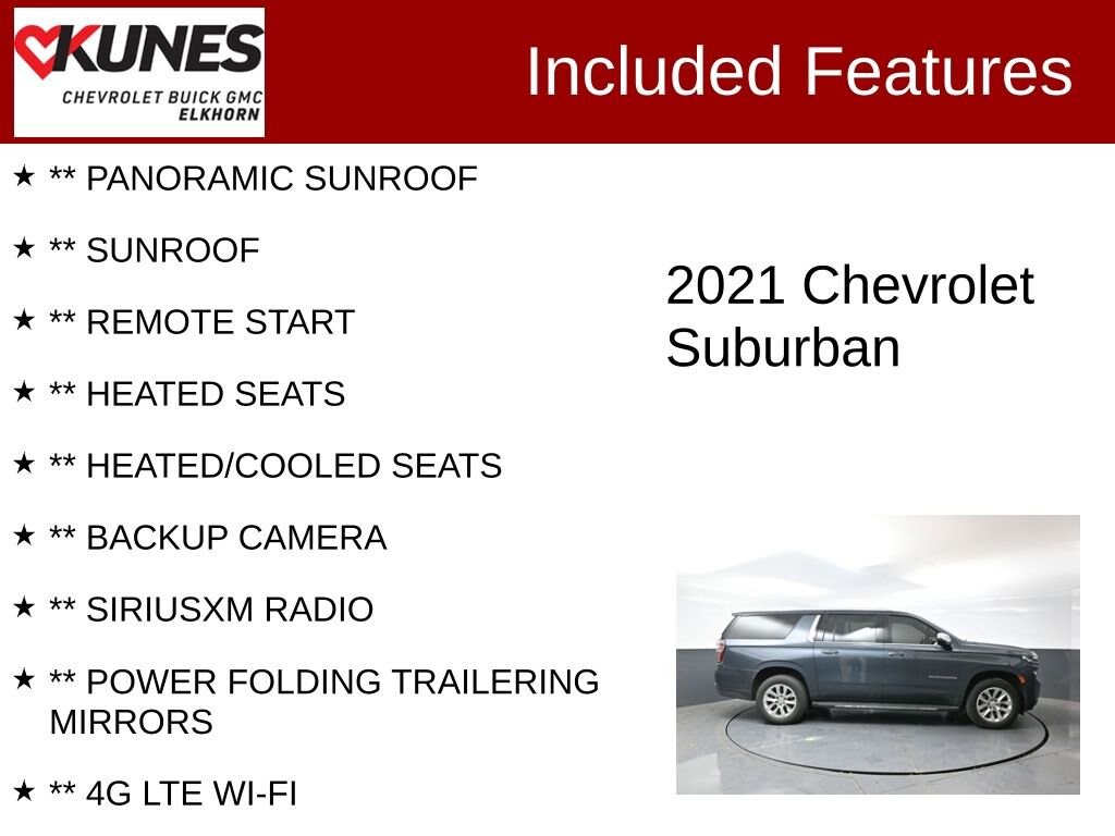 2021 Chevrolet Suburban Premier Shadow Gray Metallic 4WD 3.0L I6Recent Arrival! Panoramic sunroof for open-air driving Running boards for easier entry and exit 3.0L I-6 diesel turbocharged engine Rear seat media and premium connectivity features Adaptive cruise control Heated and ventilated front seats Heated second row and rear seats Blind spot monitoring for added safety Cross-traffic alert and rear parking sensors Tow hitch for hauling capability Power liftgate and remote trunk release Lane departure warning and lane keeping assist Front collision mitigation and automatic emergency braking WiFi hotspot capability Keyless entry and keyless start 10-speed automatic transmission with four-wheel drive Backup camera for easy parking Satellite and HD radio entertainment Aluminum wheels with all-season tires Tri-zone climate control for personalized comfort Power-adjustable and heated mirrors with integrated turn signals