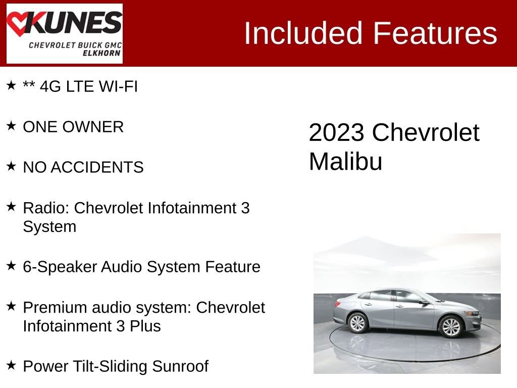 2023 Chevrolet Malibu LT 1LT 1.5L DOHC CVT FWD Clean CARFAX. CARFAX One-Owner. Odometer is 6003 miles below market average! 27/35 City/Highway MPG