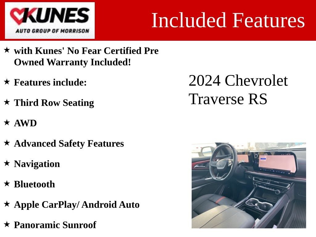 with Kunes' No Fear Certified Pre Owned Warranty Included!, Features include:, Third Row Seating, AWD, Advanced Safety Features, Navigation, Bluetooth, Apple CarPlay/ Android Auto, Panoramic Sunroof, Heated Seats, Remote Start, Rear Park Assist, Heated Steering Wheel, Backup Camera, 2nd Row Captain Seats, Traverse RS, 4D Sport Utility, AWD, Black, Jet Black Leather, Navigation System.