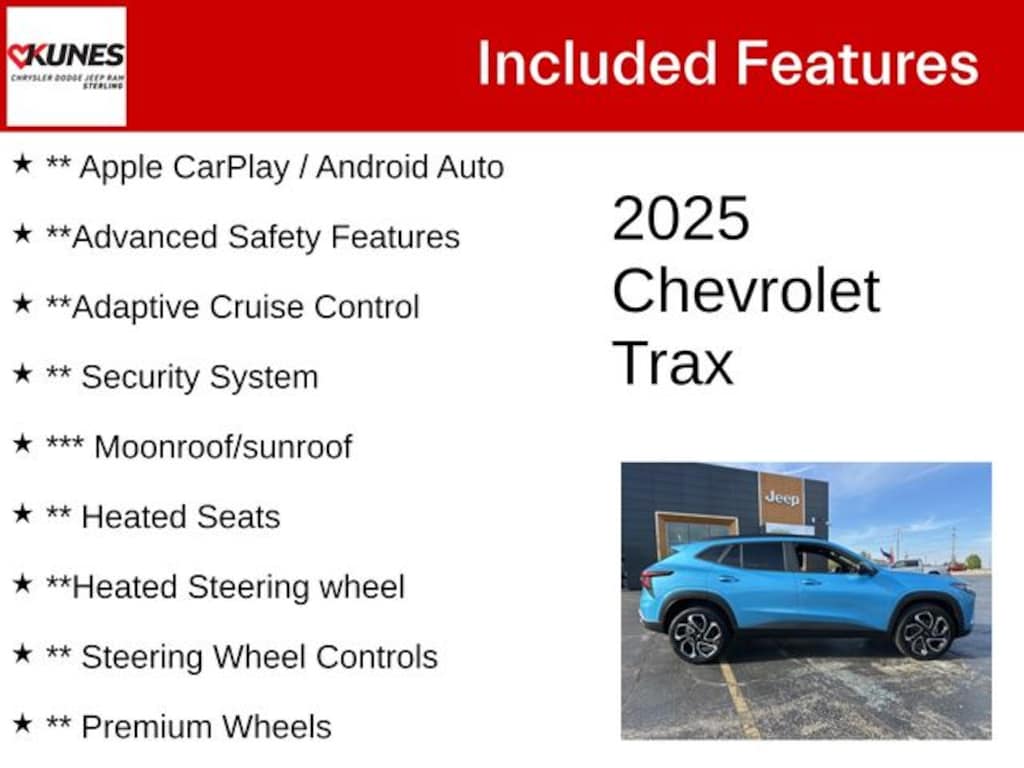 Marina Blue Metallic 2025 Chevrolet Trax 2RS 2RS with Kunes' No Fear Lifetime Certified Preowned Warranty included!, Comes with all these great features:, ** Apple CarPlay / Android Auto, **Advanced Safety Features, **Adaptive Cruise Control, ** Security System, *** Moonroof/sunroof, ** Heated Seats, **Heated Steering wheel, ** Steering Wheel Controls, ** Premium Wheels, ** Keyless Entry, ** Automatic Headlights, ** Bluetooth, ** Back up Camera, **Rear Park Assist, **SIRIUS XM, Remote Start. Recent Arrival!