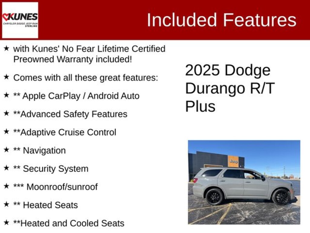 Destroyer Gray Clearcoat 2025 Dodge Durango R/T Plus R/T Plus with Kunes' No Fear Lifetime Certified Preowned Warranty included!, Comes with all these great features:, ** Apple CarPlay / Android Auto, **Advanced Safety Features, **Adaptive Cruise Control, ** Navigation, ** Security System, *** Moonroof/sunroof, ** Heated Seats, **Heated and Cooled Seats, **Heated Steering wheel, **Heated Rear Seating, 3rd Row Seating, ** Steering Wheel Controls, ** Premium Wheels, ** Keyless Entry, ** Automatic Headlights, ** Bluetooth, ** Back up Camera, **Rear Park Assist, **SIRIUS XM, Remote Start, #6 Seat Foam Cushion, 115V Auxiliary Power Outlet, 2nd Row Fold/Tumble Captain Chairs, 2nd Row Mini Console w/Cupholders, 345 Fender Badge, 3rd Row Floor Mat & Mini Console, 3rd row seats: split-bench, 7 & 4 Pin Wiring Harness, 9 Speakers, Adaptive Cruise Control w/Stop, Apple CarPlay/Android Auto, Auto High Beam Headlamp Control, Auto-Dimming Exterior Driver Mirror, Auto-dimming Rear-View mirror, Auto-leveling suspension, Black Roof Rails, Blind Spot w/Trailer Detection, Brembo Brakes, Bumpers: body-color, Class IV Receiver Hitch, Cloth Bucket Seats w/Shift Insert, Compass, Delay-off headlights, Driver door bin, Driver vanity mirror, Dual Remote USB Port - Charge Only, Emergency communication system: Dodge Connect, Exterior Mirrors w/Heating Element, Exterior Mirrors w/Supplemental Signals, Floor Console w/Leather Armrest, Forged Carbon Fiber Interior Accents, Front Bucket Seats, Front Center Armrest w/Storage, Front reading lights, Garage door transmitter, Gloss Black Badges, Gloss Black Exterior Mirrors, Heated front seats, HEMI Hood Graphic, Illuminated entry, Integrated Roof Rail Crossbars, Leather Trimmed Bucket Seats, Leather Wrapped Door Panels, LED Auxiliary Low Beam & Turn Signal, Outside temperature display, Overhead console, Passenger door bin, Passenger vanity mirror, Power 6x9 Multi-Function Foldaway Mirrors, Power 8-Way Driver Memory 8-Way Passenger Seats, Power Driver/Passenger 4-Way Lumbar Adjust, Power Sunroof, Power Tilt & Telescopic Steering Column, Radford Track Experience, Radio: Uconnect 5 Nav w/10.1" Display, Radio/Driver Seat/Mirrors Memory, Rear reading lights, Rear seat center armrest, Red Accent Stitching, Satin Black Dodge Tail Lamp Badge, Speed control, Speed-sensing steering, Split folding rear seat, Spoiler, Sport steering wheel, SRT Performance Seat w/345 Logo, Tachometer, Telescoping steering wheel, Tilt steering wheel, Trailer Brake Control, Trip computer, Ventilated Front Seats, Voltmeter, Wheels: 20" x 8.0" Fine Silver.