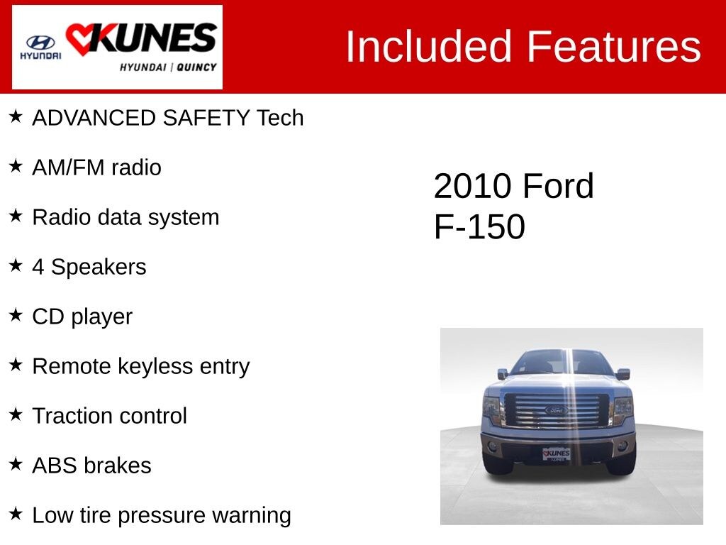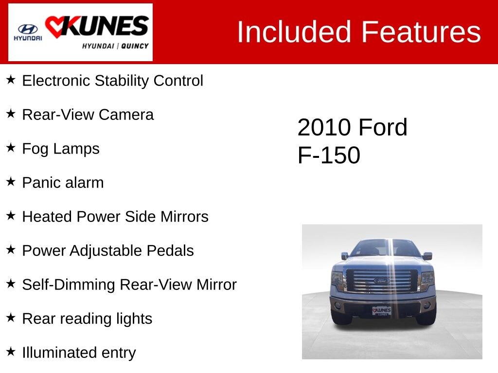 ADVANCED SAFETY Tech, 4WD, 4 Speakers, 6-Way Power Driver Seat, ABS brakes, Alloy wheels, AM/FM radio, AM/FM Stereo/Clock/Single CD, CD player, Compass, Electronic Stability Control, Fog Lamps, Front Center Armrest w/Storage, Heated Power Side Mirrors, Illuminated entry, Low tire pressure warning, Outside temperature display, Panic alarm, Power Adjustable Pedals, Radio data system, Rear reading lights, Rear-View Camera, Remote keyless entry, Self-Dimming Rear-View Mirror, Traction control. Clean CARFAX. White 2010 Ford F-150 XLT 4WD 6-Speed Automatic Electronic 5.4L V8 EFI 24V FFV