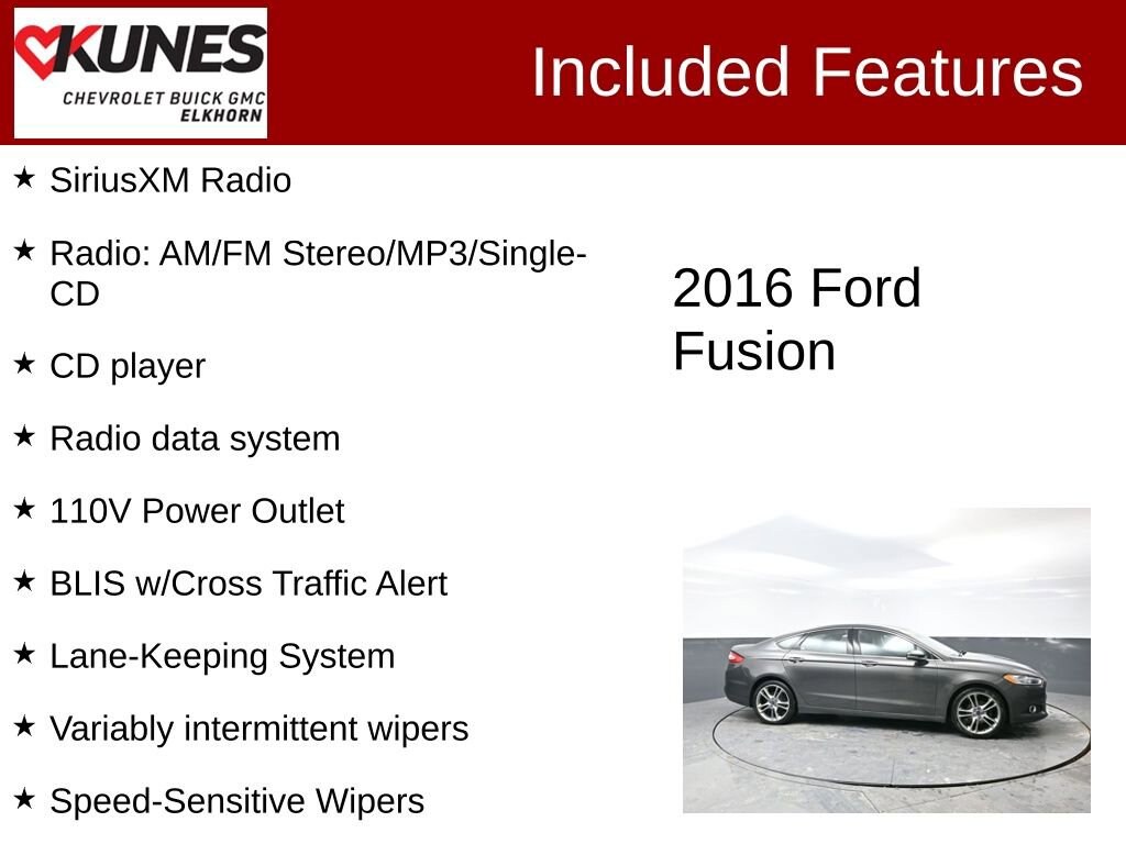 2016 Ford Fusion Titanium EcoBoost 2.0L I4 GTDi DOHC Turbocharged VCT 6-Speed Automatic AWD 22/31 City/Highway MPG