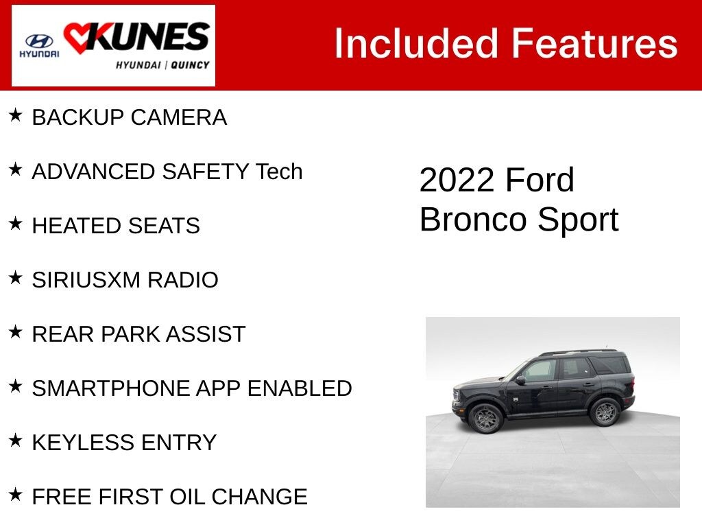 Certified. BACKUP CAMERA, ADVANCED SAFETY Tech, HEATED SEATS, SIRIUSXM RADIO, REAR PARK ASSIST, SMARTPHONE APP ENABLED, KEYLESS ENTRY, FREE FIRST OIL CHANGE. CARFAX One-Owner. Shadow Black 2022 Ford Bronco Sport Big Bend 4WD 8-Speed Automatic 1.5L EcoBoost 25/28 City/Highway MPG Odometer is 8701 miles below market average!