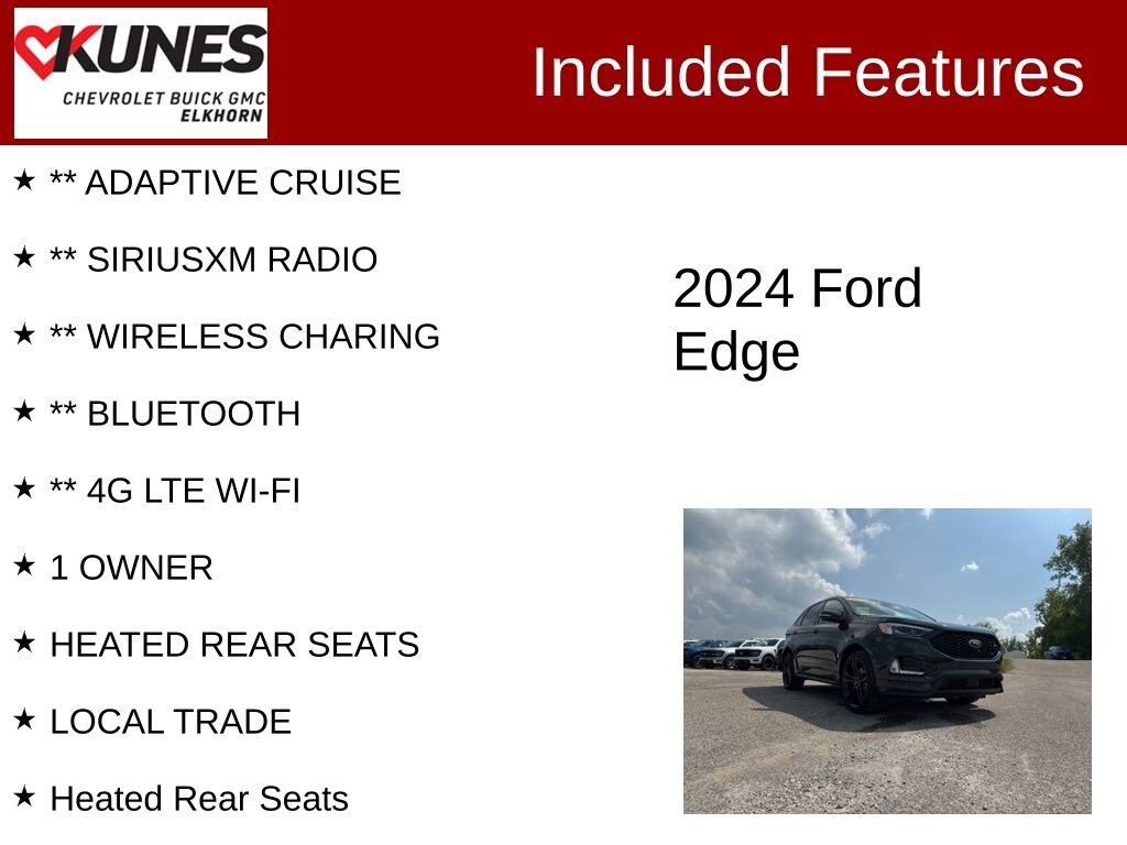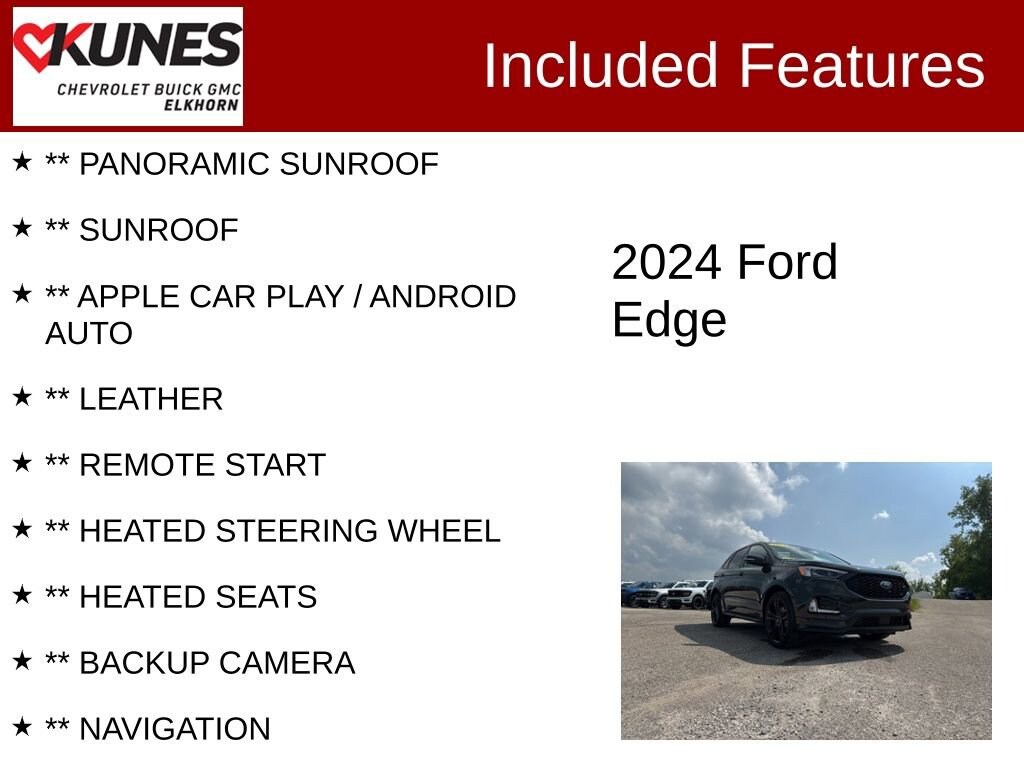 ** PANORAMIC SUNROOF, ** SUNROOF, ** APPLE CAR PLAY / ANDROID AUTO, ** LEATHER, ** REMOTE START, ** HEATED STEERING WHEEL, ** HEATED SEATS, ** BACKUP CAMERA, ** NAVIGATION, ** ADAPTIVE CRUISE, ** SIRIUSXM RADIO, ** WIRELESS CHARING, ** BLUETOOTH, ** 4G LTE WI-FI, 1 OWNER, HEATED REAR SEATS, LOCAL TRADE, AWD, Heated Rear Seats.Certified. Certification Program Details:** NO FEAR LIFETIME CERTIFIED PREOWNED **Over $2,895 of value at no cost!*LIFETIME WARRANTY!*3 Day Exchange Policy!*Complimentary powertrain warranty with ability to upgrade to fully comprehensive coverage and/or extend up to 125,000 miles!*125+ Point Inspection by our factory trained ASE Certified technicians and reconditioned to the highest standards.*Complimentary AutoCheck History Report*Complimentary AutoCheck Buyback Protection*Financing for Everyone - Guaranteed credit approval regardless of credit history!*Over 30 lenders who compete to get you the best financing terms*No payments for up to 90 days!*Weekly, Bi-Weekly, and Monthly Payment Options for all buyers!*First Free Oil Change!*Trade anytime policy - cars, trucks, boats, RVs, motorcycles - as long as we donât have to feed it, you can trade it!2024 Ford Edge ST 2.7L V6 EcoBoost 7-Speed Automatic AWD Clean CARFAX. CARFAX One-Owner.Find out why our dealerships have won DealerRater.com DEALER OF THE YEAR a whopping 10 TIMES! Call, email, or live chat with one of our friendly sales professionals now to schedule your test drive! Ask about some of our other Chevrolet, GMC, Buick, Ford, Chrysler, Dodge, Jeep, Ram, Tesla, Kia, Hyundai, INFINITI, BMW, Mercedes, Toyota, Lexus, Nissan, Volkswagen, Hummer, Lincoln, Mazda, Mitsubishi, Honda, Acura, and other vehicles that may have navigation, sunroof, adaptive cruise control, leather, cooled seats, blind spot monitor, lane keep assist, panoramic moonroof, tow hitch, Bose audio, Harman Kardon, Sony, remote start, AWD, all wheel drive, 4x4, wireless charging, sirius XM, heated seats, heated steering wheel, V8, diesel, chrome, bed-liner, luggage rack, sensing, power folding mirrors, 5th wheel, gooseneck, autopilot, self-driving, EV, remote locking tailgate, LT, LTZ, High Country, LX, EX, EX-L, DVD, rear entertainment, rear bucket seats, S, SV, SL, premium, black edition, soft top, hard top, convertible, rally stripes, GT, Shelby, Z71, XL, XLT, Lariat, Denali, SLT, SLE, RS, Rebel, Preferred, Premier, Essence, Limited, Luxury, and more. Prices shown do not include tax, title, registration and $499 service fees.