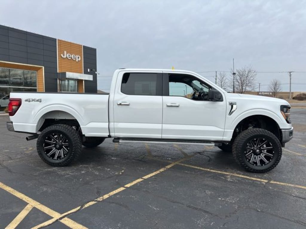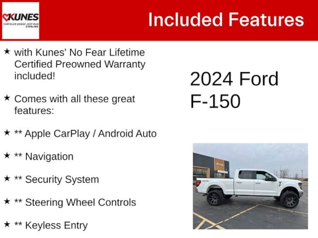 White 2024 Ford F-150 XLT XLT with Kunes' No Fear Lifetime Certified Preowned Warranty included!, Comes with all these great features:, **4 inch Lift, Custom Wheels**, ** Apple CarPlay / Android Auto, ** Navigation, ** Security System, ** Steering Wheel Controls, ** Keyless Entry, ** Automatic Headlights, ** Bluetooth, ** Back up Camera, **Rear Park Assist, **SIRIUS XM, F-150 XLT, 4D SuperCrew, 4WD, White, Black/Slate Gray Cloth, Equipment Group 301A Standard, Navigation system: Connected Navigation, Tow/Haul Package. Recent Arrival!