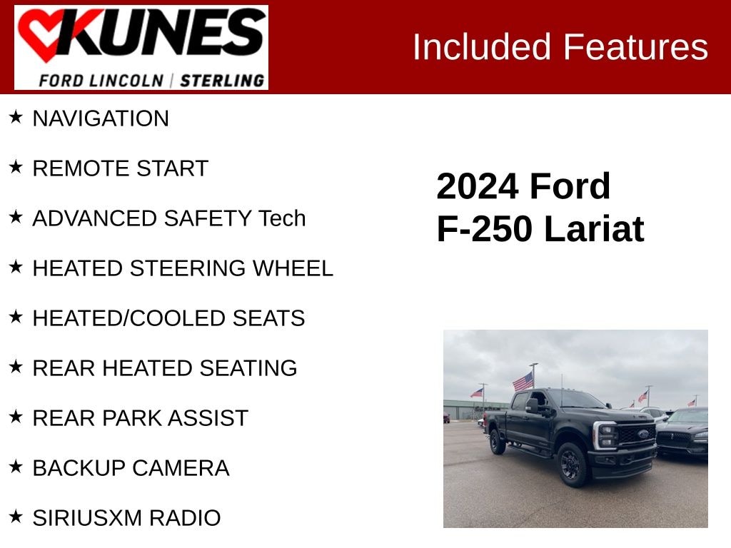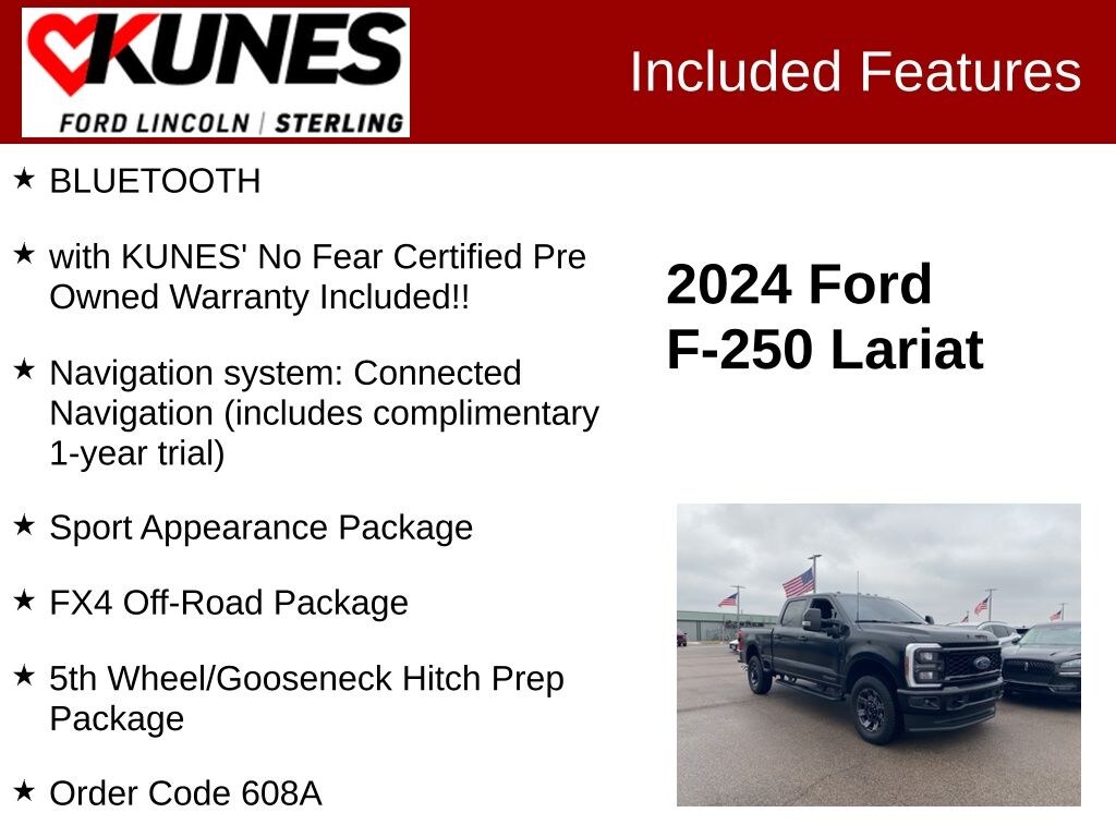 NAVIGATION, REMOTE START, ADVANCED SAFETY Tech, HEATED STEERING WHEEL, HEATED/COOLED SEATS, REAR HEATED SEATING, REAR PARK ASSIST, BACKUP CAMERA, SIRIUSXM RADIO, BLUETOOTH, F-250 SuperDuty Lariat, 4D Crew Cab, Power Stroke 6.7L V8 DI 32V OHV Turbodiesel, 10-Speed Automatic, 4WD, Black Metallic, Black Onyx Leather, 5th Wheel/Gooseneck Hitch Prep Package, Body-Color Front & Rear Bumpers, Bumpers: chrome, F-250 >10K GVWR Package, FX4 Off-Road Package, Hill Descent Control, Navigation system: Connected Navigation (includes complimentary 1-year trial), Order Code 608A, Rain sensing wipers, Rear window defroster, Sport Appearance Package, Variably intermittent wipers, Wheels: 18" Bright Machined & Carbonized Gray Alum.