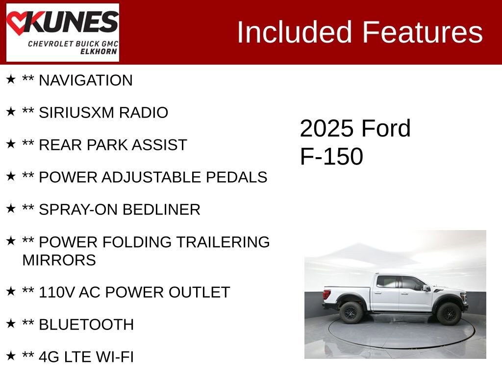 ** PANORAMIC SUNROOF, ** SUNROOF, ** APPLE CAR PLAY / ANDROID AUTO, ** LEATHER, ** REMOTE START, ** HEATED STEERING WHEEL, ** HEATED SEATS, ** HEATED/COOLED SEATS, ** BACKUP CAMERA, ** NAVIGATION, ** SIRIUSXM RADIO, ** REAR PARK ASSIST, ** POWER ADJUSTABLE PEDALS, ** SPRAY-ON BEDLINER, ** POWER FOLDING TRAILERING MIRRORS, ** 110V AC POWER OUTLET, ** BLUETOOTH, ** 4G LTE WI-FI, LOCAL TRADE, 1 OWNER, 4WD, 14 Speakers, Adjustable pedals, Alloy wheels, AM/FM radio: SiriusXM with 360L, Auto High-beam Headlights, Auto tilt-away steering wheel, Auto-dimming door mirrors, Auto-dimming Rear-View mirror, Bumpers: body-color, Compass, Delay-off headlights, Driver door bin, Driver vanity mirror, Front anti-roll bar, Front Center Armrest, Front fog lights, Front reading lights, Front wheel independent suspension, Fully automatic headlights, Garage door transmitter, Heads-Up Display, Heated door mirrors, Heated rear seats, Heated steering wheel, Illuminated entry, Lane Departure Warning System, Leather steering wheel, Memory seat, Navigation system: Connected Navigation, Outside temperature display, Overhead console, Passenger vanity mirror, Pedal memory, Radio data system, Rain sensing wipers, Rear reading lights, Rear step bumper, Rear window defroster, Speed control, Speed-sensing steering, Split folding rear seat, Steering wheel memory, Steering wheel mounted audio controls, Tachometer, Trip computer, Turn signal indicator mirrors, Variably intermittent wipers.Certified. Certification Program Details:** NO FEAR LIFETIME CERTIFIED PREOWNED **Over $2,895 of value at no cost!*LIFETIME WARRANTY!*3 Day Exchange Policy!*Complimentary powertrain warranty with ability to upgrade to fully comprehensive coverage and/or extend up to 125,000 miles!*125+ Point Inspection by our factory trained ASE Certified technicians and reconditioned to the highest standards.*Complimentary AutoCheck History Report*Complimentary AutoCheck Buyback Protection*Financing for Everyone - Guaranteed credit approval regardless of credit history!*Over 30 lenders who compete to get you the best financing terms*No payments for up to 90 days!*Weekly, Bi-Weekly, and Monthly Payment Options for all buyers!*First Free Oil Change!*Trade anytime policy - cars, trucks, boats, RVs, motorcycles - as long as we donât have to feed it, you can trade it!2025 Ford F-150 Raptor 3.5L V6 EcoBoost 10-Speed Automatic 4WD Clean CARFAX. CARFAX One-Owner.Find out why our dealerships have won DealerRater.com DEALER OF THE YEAR a whopping 10 TIMES! Call, email, or live chat with one of our friendly sales professionals now to schedule your test drive! Ask about some of our other Chevrolet, GMC, Buick, Ford, Chrysler, Dodge, Jeep, Ram, Tesla, Kia, Hyundai, INFINITI, BMW, Mercedes, Toyota, Lexus, Nissan, Volkswagen, Hummer, Lincoln, Mazda, Mitsubishi, Honda, Acura, and other vehicles that may have navigation, sunroof, adaptive cruise control, leather, cooled seats, blind spot monitor, lane keep assist, panoramic moonroof, tow hitch, Bose audio, Harman Kardon, Sony, remote start, AWD, all wheel drive, 4x4, wireless charging, sirius XM, heated seats, heated steering wheel, V8, diesel, chrome, bed-liner, luggage rack, sensing, power folding mirrors, 5th wheel, gooseneck, autopilot, self-driving, EV, remote locking tailgate, LT, LTZ, High Country, LX, EX, EX-L, DVD, rear entertainment, rear bucket seats, S, SV, SL, premium, black edition, soft top, hard top, convertible, rally stripes, GT, Shelby, Z71, XL, XLT, Lariat, Denali, SLT, SLE, RS, Rebel, Preferred, Premier, Essence, Limited, Luxury, and more. Prices shown do not include tax, title, registration and $499 service fees.