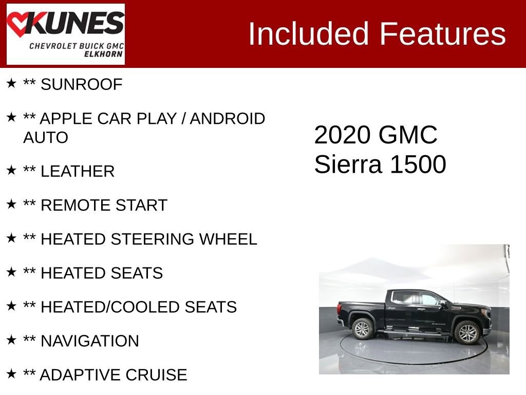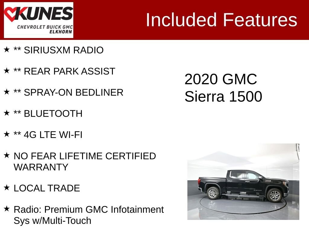 ** SUNROOF, ** APPLE CAR PLAY / ANDROID AUTO, ** LEATHER, ** REMOTE START, ** HEATED STEERING WHEEL, ** HEATED SEATS, ** HEATED/COOLED SEATS, ** NAVIGATION, ** ADAPTIVE CRUISE, ** SIRIUSXM RADIO, ** REAR PARK ASSIST, ** SPRAY-ON BEDLINER, ** BLUETOOTH, ** 4G LTE WI-FI, NO FEAR LIFETIME CERTIFIED WARRANTY, LOCAL TRADE, 10-Speed Automatic, 4WD, Jet Black Leather, 10-Way Power Driver Seat Adjuster w/Lumbar, 10-Way Power Passenger Seat Adjuster w/Lumbar, 12-Volt Rear Auxiliary Power Outlet, 120-Volt Bed Mounted Power Outlet, 120-Volt Instrument Panel Power Outlet, 2 USB Ports, 2 USB Ports (1st Row), 20 x 9 Polished Aluminum Wheels, 3.23 Rear Axle Ratio, 4G LTE Wi-Fi Hotspot Capable, 6 Speakers, 6-Speaker Audio System Feature, Adaptive Cruise Control - Camera, Air Conditioning, Alloy wheels, Auto-dimming door mirrors, Automatic temperature control, Chrome Wheel To Wheel Assist Steps, Color-Keyed Carpeting Floor Covering, Compass, Delay-off headlights, Driver door bin, Driver vanity mirror, Electrical Lock Control Steering Column, Front anti-roll bar, Front Bucket Seats, Front Center Armrest w/Storage, Front dual zone A/C, Front reading lights, GMC Connected Access Capable, Heated steering wheel, Illuminated entry, Keyless Open & Start, LED Cargo Area Lighting, Manual Tilt-Wheel & Telescoping Steering Column, Memory seat, Occupant sensing airbag, OnStar & GMC Connected Services Capable, Outside temperature display, Overhead airbag, Overhead console, Panic alarm, Passenger door bin, Passenger vanity mirror, Perforated Leather-Appointed Front Seat Trim, Perimeter Lighting, Power door mirrors, Power driver seat, Power Front Passenger Windows w/Express Up/Down, Power Front Windows w/Driver Express Up/Down, Power passenger seat, Power Rear Windows w/Express Down, Power Sunroof, Premium audio system: GMC Infotainment System, Premium Bose 7-Speaker Sound System, Radio data system, Radio: Premium GMC Infotainment Sys w/Multi-Touch, Radio: Premium GMC Infotainment Sys w/Navigation, Rear Dual USB Charging-Only Ports, Rear reading lights, Rear seat center armrest, Rear Wheelhouse Liners, Rear window defroster, Remote keyless entry, Remote Vehicle Starter System, Safety Alert Seat, Security system, Speed control, Speed-sensing steering, Split folding rear seat, Steering Wheel Audio Controls, Steering wheel mounted audio controls, Tachometer, Telescoping steering wheel, Theft Deterrent System (Unauthorized Entry), Tilt steering wheel, Trip computer, Universal Home Remote, Variably intermittent wipers, Voltmeter, Wheels: 18 x 8.5 6-Spoke Machined Aluminum, Wireless Charging.Certified. Certification Program Details:** NO FEAR LIFETIME CERTIFIED PREOWNED **Over $2,895 of value at no cost!*LIFETIME WARRANTY!*3 Day Exchange Policy!*Complimentary powertrain warranty with ability to upgrade to fully comprehensive coverage and/or extend up to 125,000 miles!*125+ Point Inspection by our factory trained ASE Certified technicians and reconditioned to the highest standards.*Complimentary AutoCheck History Report*Complimentary AutoCheck Buyback Protection*Financing for Everyone - Guaranteed credit approval regardless of credit history!*Over 30 lenders who compete to get you the best financing terms*No payments for up to 90 days!*Weekly, Bi-Weekly, and Monthly Payment Options for all buyers!*First Free Oil Change!*Trade anytime policy - cars, trucks, boats, RVs, motorcycles - as long as we donât have to feed it, you can trade it!2020 GMC Sierra 1500 SLT EcoTec3 6.2L V8 10-Speed Automatic 4WD CARFAX One-Owner.Find out why our dealerships have won DealerRater.com DEALER OF THE YEAR a whopping 10 TIMES! Call, email, or live chat with one of our friendly sales professionals now to schedule your test drive! Ask about some of our other Chevrolet, GMC, Buick, Ford, Chrysler, Dodge, Jeep, Ram, Tesla, Kia, Hyundai, INFINITI, BMW, Mercedes, Toyota, Lexus, Nissan, Volkswagen, H