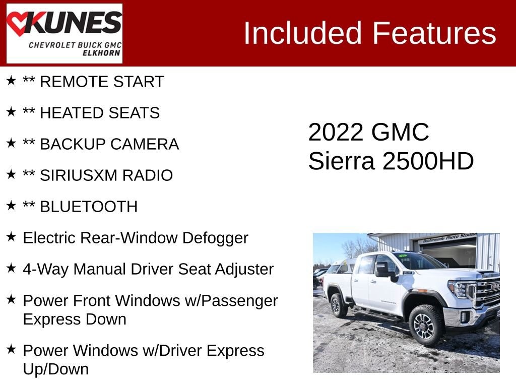 2022 GMC Sierra 2500HD SLE Summit White 4WD 6.6L V8Recent Arrival! Clean CARFAX. CARFAX One Owner. SLE Convenience Package: heated front seat, keyless entry, power driver seat, climate control, security system Preferred Package: Bluetooth, backup camera, satellite radio, sliding rear window, universal garage door opener Snow Plow Prep/Camper Package: tow hitch, trailering package, heavy-duty alternator Aluminum wheels and front all-terrain tires Heated mirrors with integrated turn signals and running boards Tow hooks and integrated tailgate step Leather-wrapped steering wheel Adjustable steering wheel; driver adjustable lumbar Cloth seats with front split bench and pass-through rear seat Power windows and power door locks Cruise control and remote engine start 6.6L V8 engine, 6-speed automatic, four-wheel drive Locking/limited-slip differential 4-wheel disc brakes and anti-lock brakes Rear defrost and sliding rear window Privacy glass and fog lamps Bed-mounted and instrument panel 120V power outlets Rear parking guidance for trailer alignment Stability control, traction control, daytime running lights Multiple airbags including head curtain and side airbags
