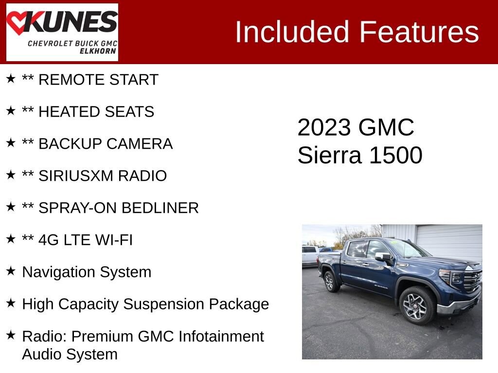 2023 GMC Sierra 1500 SLT Pacific Blue Metallic 4WD 3.0L I6Recent Arrival! Clean CARFAX. CARFAX One Owner. X31 Off-Road and Protection Package adds all-terrain tires, aluminum wheels, bed liner, and front/rear floor mats SLT Convenience Package includes heated front seats, cooled front seat, adjustable steering wheel, power driver and passenger seat, premium sound system, auxiliary audio input, and MP3 player 3.0L I-6 Diesel Turbocharged engine with 10-speed automatic transmission and four-wheel drive Pacific Blue Metallic exterior paint Trailering package and tow hitch Bed liner Heated mirrors with power-fold and memory function Power mirrors and rain sensing wipers Keyless entry, keyless start, and remote engine start Backup camera Premium sound system and satellite radio Multi-zone climate control and air conditioning Rear defrost and auto-dimming rearview mirror Floor mats and pass-through rear seat Front and rear air bags, head air bags, front collision mitigation, and warning Lane departure warning, lane keeping assist, and automatic highbeams Skid plates, locking/limited slip differential, electronic Autotrac transfer case, hill descent control Four-wheel disc brakes with anti-lock braking Power door locks and power steering