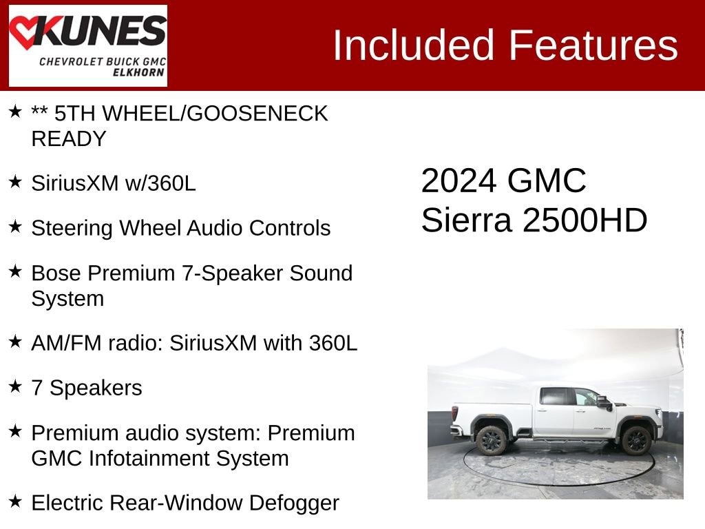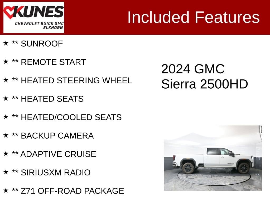** SUNROOF, ** APPLE CAR PLAY / ANDROID AUTO, ** LEATHER, ** REMOTE START, ** HEATED STEERING WHEEL, ** HEATED SEATS, ** HEATED/COOLED SEATS, ** BACKUP CAMERA, ** NAVIGATION, ** ADAPTIVE CRUISE, ** SIRIUSXM RADIO, ** WIRELESS CHARING, ** Z71 OFF-ROAD PACKAGE, ** 5TH WHEEL/GOOSENECK READY, ** BLUETOOTH, ** 4G LTE WI-FI, NO ACCIDENTS, LOCAL TRADE, ONE OWNER, 10-Speed Automatic, 4WD, Black Leather, 10-Way Power Driver Seat Adjuster w/Lumbar, 10-Way Power Passenger Seat Adjuster w/Lumbar, 120-Volt Bed Mounted Power Outlet, 120-Volt Instrument Panel Power Outlet, 2 Charge-Only Rear USB Ports, 2 Charge/Data USB Ports Inside Center Console, 2 USB Ports, 2-Speed Active Transfer Case, 220-Amp Alternator, 3.73 Rear Axle Ratio, 7 Speakers, Adaptive Cruise Control, Air Conditioning, Alloy wheels, AM/FM radio: SiriusXM with 360L, Apple CarPlay/Android Auto, Bose Premium 7-Speaker Sound System, Buckle to Drive, Bumpers: body-color, Compass, Delay-off headlights, Driver door bin, Driver vanity mirror, Electric Rear-Window Defogger, Floor-Mounted Center Console, Following Distance Indicator, Front anti-roll bar, Front Bucket Seats, Front Center Armrest, Front dual zone A/C, Front Prem Floor Liners w/Removable Carpet Insert, Front reading lights, Front wheel independent suspension, Gloss Black Header Grille & Grille Insert Bars, GMC Connected Access Capable, HD Surround Vision, Heated door mirrors, Heavy-Duty 80 Amp Battery, Hill Descent Control, Illuminated entry, LED Smoked Amber Roof Marker Lamps, OnStar & GMC Connected Services Capable, Overhead console, Panic alarm, Passenger door bin, Passenger vanity mirror, Perforated Leather-Appointed Front Seat Trim, Pickup Box, Power door mirrors, Power Front Passenger Windows w/Express Up/Down, Power passenger seat, Power windows, Premium audio system: Premium GMC Infotainment System, Rear Prem Floor Liners w/Removable Carpet Insert, Rear reading lights, Rear seat center armrest, Rear step bumper, Rear window defroster, Safety Alert Seat, Security system, SiriusXM w/360L, Speed-sensing steering, Split folding rear seat, Spray-On Bedliner w/AT4 Logo, Steering Wheel Audio Controls, Steering wheel mounted audio controls, Tilt steering wheel, Trailer Side Blind Zone Alert, Trip computer, Turn signal indicator mirrors, Ultrasonic Front & Rear Park Assist, Unauthorized Entry Theft-Deterrent System, Universal Home Remote, Voltmeter, Wheels: 20 High Gloss Black 8 Spokes Aluminum, Wireless Charging, Wireless Phone Projection.Certified. Certification Program Details:** NO FEAR LIFETIME CERTIFIED PREOWNED **Over $2,895 of value at no cost!*LIFETIME WARRANTY!*3 Day Exchange Policy!*Complimentary powertrain warranty with ability to upgrade to fully comprehensive coverage and/or extend up to 125,000 miles!*125+ Point Inspection by our factory trained ASE Certified technicians and reconditioned to the highest standards.*Complimentary AutoCheck History Report*Complimentary AutoCheck Buyback Protection*Financing for Everyone - Guaranteed credit approval regardless of credit history!*Over 30 lenders who compete to get you the best financing terms*No payments for up to 90 days!*Weekly, Bi-Weekly, and Monthly Payment Options for all buyers!*First Free Oil Change!*Trade anytime policy - cars, trucks, boats, RVs, motorcycles - as long as we donât have to feed it, you can trade it!2024 GMC Sierra 2500HD AT4 Duramax 6.6L V8 Turbodiesel 10-Speed Automatic 4WD Clean CARFAX.Find out why our dealerships have won DealerRater.com DEALER OF THE YEAR a whopping 10 TIMES! Call, email, or live chat with one of our friendly sales professionals now to schedule your test drive! Ask about some of our other Chevrolet, GMC, Buick, Ford, Chrysler, Dodge, Jeep, Ram, Tesla, Kia, Hyundai, INFINITI, BMW, Mercedes, Toyota, Lexus, Nissan, Volkswagen, Hummer, Lincoln, Mazda, Mitsubishi, Honda, Acura, and other vehicles that may have navigation, sunroof, ad