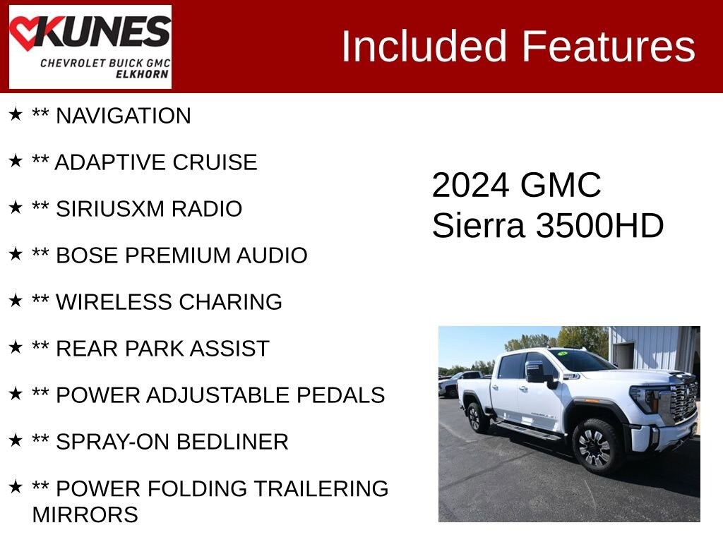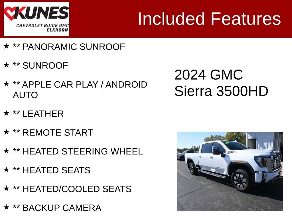 ** PANORAMIC SUNROOF, ** SUNROOF, ** APPLE CAR PLAY / ANDROID AUTO, ** LEATHER, ** REMOTE START, ** HEATED STEERING WHEEL, ** HEATED SEATS, ** HEATED/COOLED SEATS, ** BACKUP CAMERA, ** NAVIGATION, ** ADAPTIVE CRUISE, ** SIRIUSXM RADIO, ** BOSE PREMIUM AUDIO, ** WIRELESS CHARING, ** REAR PARK ASSIST, ** POWER ADJUSTABLE PEDALS, ** SPRAY-ON BEDLINER, ** POWER FOLDING TRAILERING MIRRORS, ** 110V AC POWER OUTLET, ** 5TH WHEEL/GOOSENECK READY, ** BLUETOOTH, ** 4G LTE WI-FI, NO ACCIDENTS, LOCAL TRADE, 10-Speed Automatic, 4WD, Atmosphere/Brownstone Leather, Front Rain-Sensing Wipers, Heated 2nd Row Outboard Seats, Heated rear seats, In-Vehicle Trailering App, Rain sensing wipers, Variably intermittent wipers, Wireless Phone Projection.Certified. Certification Program Details:** NO FEAR LIFETIME CERTIFIED PREOWNED **Over $2,895 of value at no cost!*LIFETIME WARRANTY!*3 Day Exchange Policy!*Complimentary powertrain warranty with ability to upgrade to fully comprehensive coverage and/or extend up to 125,000 miles!*125+ Point Inspection by our factory trained ASE Certified technicians and reconditioned to the highest standards.*Complimentary AutoCheck History Report*Complimentary AutoCheck Buyback Protection*Financing for Everyone - Guaranteed credit approval regardless of credit history!*Over 30 lenders who compete to get you the best financing terms*No payments for up to 90 days!*Weekly, Bi-Weekly, and Monthly Payment Options for all buyers!*First Free Oil Change!*Trade anytime policy - cars, trucks, boats, RVs, motorcycles - as long as we donât have to feed it, you can trade it!2024 GMC Sierra 3500HD Denali Duramax 6.6L V8 Turbodiesel 10-Speed Automatic 4WD Clean CARFAX. Odometer is 5465 miles below market average!Find out why our dealerships have won DealerRater.com DEALER OF THE YEAR a whopping 10 TIMES! Call, email, or live chat with one of our friendly sales professionals now to schedule your test drive! Ask about some of our other Chevrolet, GMC, Buick, Ford, Chrysler, Dodge, Jeep, Ram, Tesla, Kia, Hyundai, INFINITI, BMW, Mercedes, Toyota, Lexus, Nissan, Volkswagen, Hummer, Lincoln, Mazda, Mitsubishi, Honda, Acura, and other vehicles that may have navigation, sunroof, adaptive cruise control, leather, cooled seats, blind spot monitor, lane keep assist, panoramic moonroof, tow hitch, Bose audio, Harman Kardon, Sony, remote start, AWD, all wheel drive, 4x4, wireless charging, sirius XM, heated seats, heated steering wheel, V8, diesel, chrome, bed-liner, luggage rack, sensing, power folding mirrors, 5th wheel, gooseneck, autopilot, self-driving, EV, remote locking tailgate, LT, LTZ, High Country, LX, EX, EX-L, DVD, rear entertainment, rear bucket seats, S, SV, SL, premium, black edition, soft top, hard top, convertible, rally stripes, GT, Shelby, Z71, XL, XLT, Lariat, Denali, SLT, SLE, RS, Rebel, Preferred, Premier, Essence, Limited, Luxury, and more. Prices shown do not include tax, title, registration and $499 service fees.