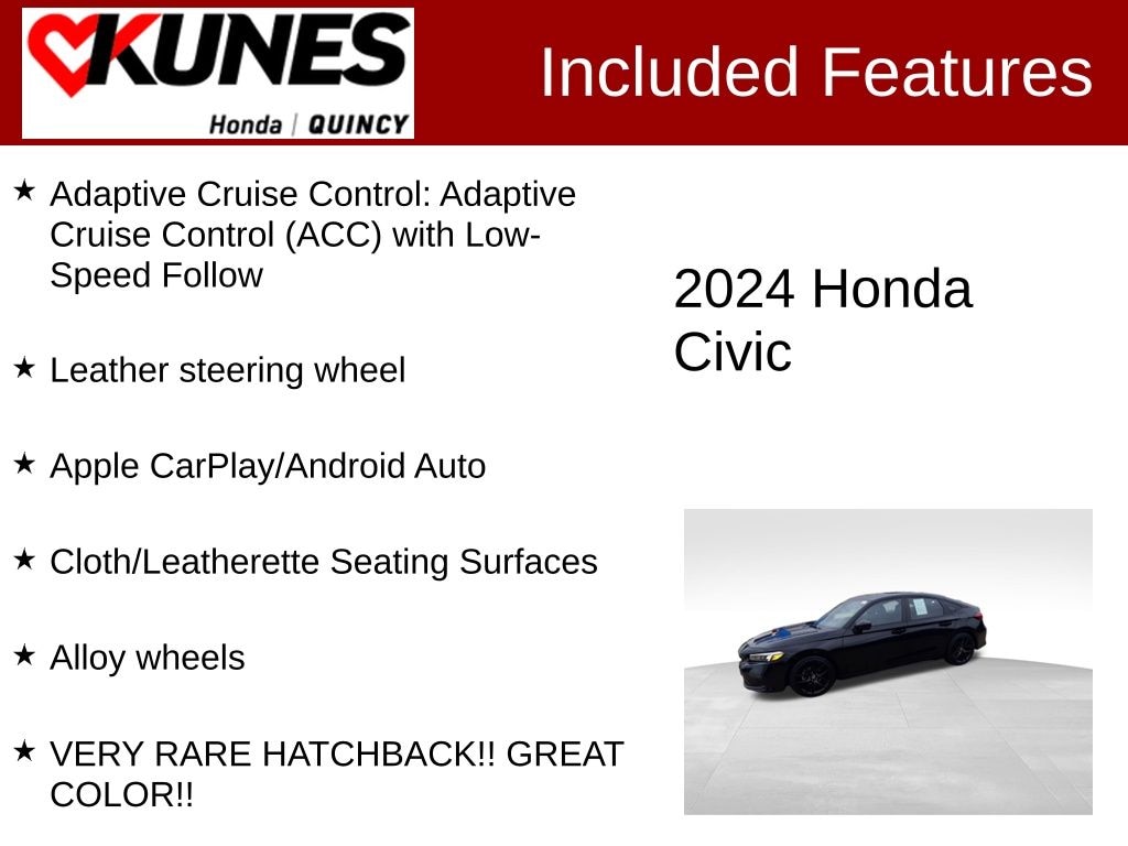 CARFAX One-Owner. Clean CARFAX. Black 2024 Honda Civic Sport FWD CVT 2.0L I4 DOHC 16V VERY RARE HATCHBACK!! GREAT COLOR!!, Black w/Cloth/Leatherette Seating Surfaces, 4-Wheel Disc Brakes, ABS brakes, Adaptive Cruise Control: Adaptive Cruise Control (ACC) with Low-Speed Follow, Alloy wheels, Apple CarPlay/Android Auto, Automatic temperature control, Cloth/Leatherette Seating Surfaces, Exterior Parking Camera Rear, Lane departure: Lane Keeping Assist System (LKAS) active, Leather steering wheel, Remote keyless entry, Steering wheel mounted audio controls, Traction control. 29/37 City/Highway MPG