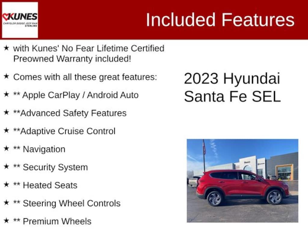 Calypso Red 2023 Hyundai Santa Fe SEL SEL with Kunes' No Fear Lifetime Certified Preowned Warranty included!, Comes with all these great features:, ** Apple CarPlay / Android Auto, **Advanced Safety Features, **Adaptive Cruise Control, ** Navigation, ** Security System, ** Heated Seats, ** Steering Wheel Controls, ** Premium Wheels, ** Keyless Entry, ** Automatic Headlights, ** Bluetooth, ** Back up Camera, **SIRIUS XM, Remote Start.