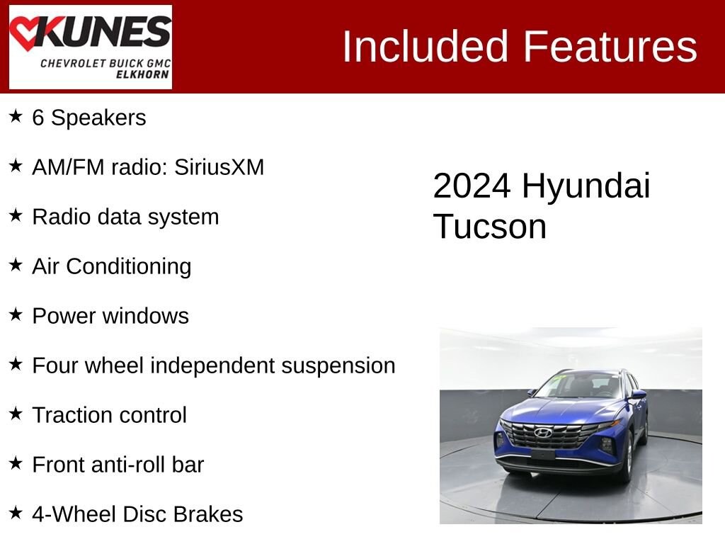 2024 Hyundai Tucson SEL Intense Blue FWD 2.5L I4 DGI DOHC 16V LEV3-SULEV30 187hpRecent Arrival! Clean CARFAX. CARFAX One Owner.NO FEAR LIFETIME CERTIFIED PREOWNED **Over $2,895 of value at no cost!LIFETIME WARRANTY!3 Day Exchange Policy!Complimentary powertrain warranty with ability to upgrade to fully comprehensive coverage and/or extend up to 125,000 miles!125+ Point Inspection by our factory trained ASE Certified technicians and reconditioned to the highest standards.Complimentary AutoCheck History ReportComplimentary AutoCheck Buyback ProtectionFinancing for Everyone - Guaranteed credit approval regardless of credit history!Over 30 lenders who compete to get you the best financing termsNo payments for up to 90 days!Weekly, Bi-Weekly, and Monthly Payment Options for all buyers!First Free Oil Change!Trade anytime policy - cars, trucks, boats, RVs, motorcycles - as long as we don't have to feed it, you can trade it! Option Group 01: Includes hands-free liftgate, keyless entry, and push-button start Adaptive cruise control for easier highway driving Heated front seats with power adjustment for the driver Blind spot monitoring and rear cross-traffic alert for added safety Back-up camera for easy and safe reversing Bluetooth connectivity and integrated Apple CarPlay/Android Auto AM/FM/HD radio, MP3 player, satellite radio, and steering wheel audio controls Dual-zone automatic climate control for driver and front passenger Power liftgate with remote and hands-free function Keyless entry and keyless start Rear parking sensors and lane departure warning Front collision mitigation with driver monitoring system LED headlights with automatic high beams and daytime running lights Alloy wheels and fully galvanized steel panels 2.5L I-4 engine with 8-speed automatic transmission Four-wheel disc brakes, anti-lock brakes, and brake assist Multi-link rear suspension with coil springs for a smooth ride Rear spoiler, privacy glass, and integrated roof antenna Adjustable steering wheel, bucket front seats, and second row bench Bluelink+ connected car tracker system