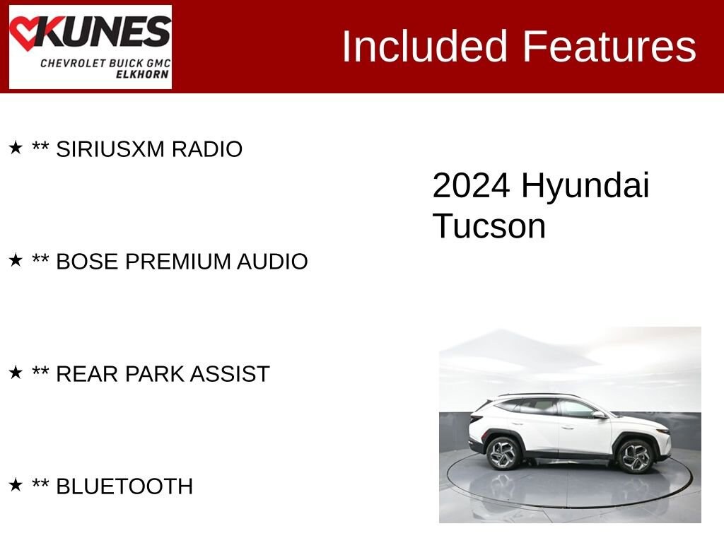 ** PANORAMIC SUNROOF, ** SUNROOF, ** APPLE CAR PLAY / ANDROID AUTO, ** LEATHER, ** HEATED STEERING WHEEL, ** HEATED SEATS, ** HEATED/COOLED SEATS, ** BACKUP CAMERA, ** NAVIGATION, ** SIRIUSXM RADIO, ** BOSE PREMIUM AUDIO, ** REAR PARK ASSIST, ** BLUETOOTH, LOCAL TRADE, AWD.Certified. Certification Program Details:** NO FEAR LIFETIME CERTIFIED PREOWNED **Over $2,895 of value at no cost!*LIFETIME WARRANTY!*3 Day Exchange Policy!*Complimentary powertrain warranty with ability to upgrade to fully comprehensive coverage and/or extend up to 125,000 miles!*125+ Point Inspection by our factory trained ASE Certified technicians and reconditioned to the highest standards.*Complimentary AutoCheck History Report*Complimentary AutoCheck Buyback Protection*Financing for Everyone - Guaranteed credit approval regardless of credit history!*Over 30 lenders who compete to get you the best financing terms*No payments for up to 90 days!*Weekly, Bi-Weekly, and Monthly Payment Options for all buyers!*First Free Oil Change!*Trade anytime policy - cars, trucks, boats, RVs, motorcycles - as long as we donât have to feed it, you can trade it!2024 Hyundai Tucson Limited 2.5L I4 DGI DOHC 16V LEV3-SULEV30 187hp 8-Speed Automatic with SHIFTRONIC AWD CARFAX One-Owner. 23/29 City/Highway MPGFind out why our dealerships have won DealerRater.com DEALER OF THE YEAR a whopping 10 TIMES! Call, email, or live chat with one of our friendly sales professionals now to schedule your test drive! Ask about some of our other Chevrolet, GMC, Buick, Ford, Chrysler, Dodge, Jeep, Ram, Tesla, Kia, Hyundai, INFINITI, BMW, Mercedes, Toyota, Lexus, Nissan, Volkswagen, Hummer, Lincoln, Mazda, Mitsubishi, Honda, Acura, and other vehicles that may have navigation, sunroof, adaptive cruise control, leather, cooled seats, blind spot monitor, lane keep assist, panoramic moonroof, tow hitch, Bose audio, Harman Kardon, Sony, remote start, AWD, all wheel drive, 4x4, wireless charging, sirius XM, heated seats, heated steering wheel, V8, diesel, chrome, bed-liner, luggage rack, sensing, power folding mirrors, 5th wheel, gooseneck, autopilot, self-driving, EV, remote locking tailgate, LT, LTZ, High Country, LX, EX, EX-L, DVD, rear entertainment, rear bucket seats, S, SV, SL, premium, black edition, soft top, hard top, convertible, rally stripes, GT, Shelby, Z71, XL, XLT, Lariat, Denali, SLT, SLE, RS, Rebel, Preferred, Premier, Essence, Limited, Luxury, and more. Prices shown do not include tax, title, registration and $499 service fees.